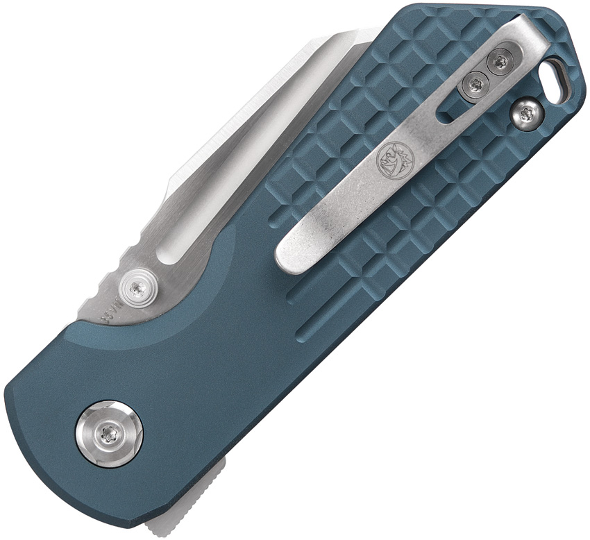 4.13″ (10.49cm) closed. 3″ (7.62cm) two-tone finish S35VN stainless sheepsfoot blade. Blue aluminum handle. Thumb stud. Lanyard hole. Pocket clip. Black nylon zippered storage case. Boxed.