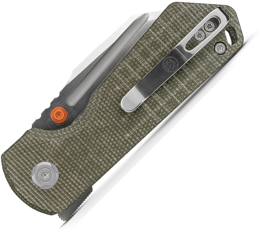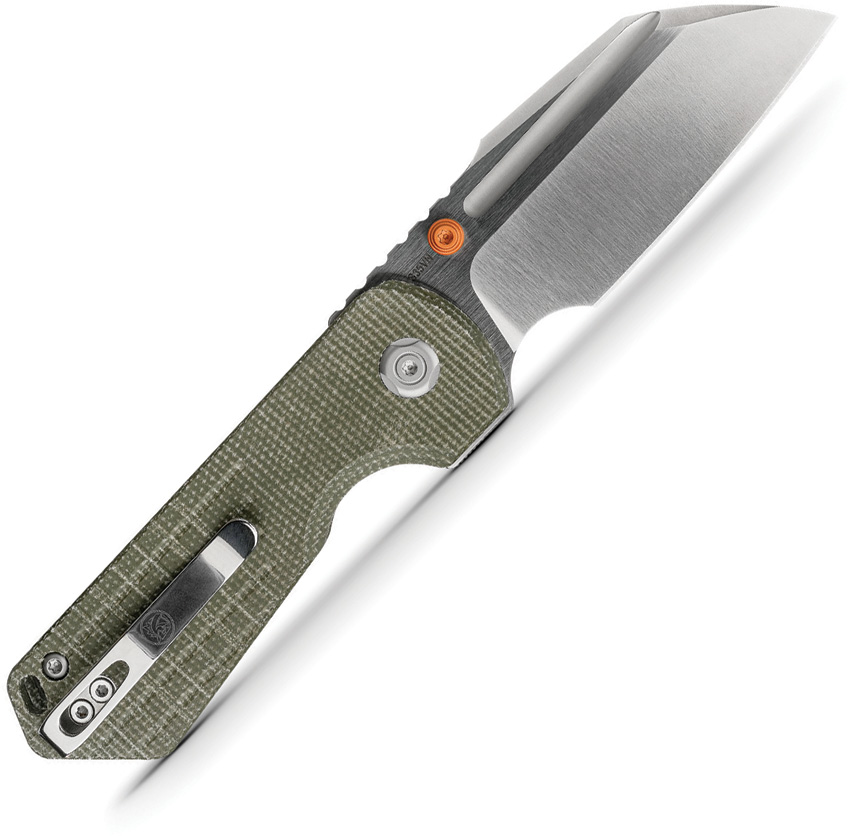 4.13″ (10.49cm) closed. 3″ (7.62cm) S35VN stainless sheepsfoot blade. Green canvas micarta handle. Thumb stud. Extended tang. Pocket clip. Satin and brushed finish blade. Black nylon zippered storage case. Boxed.