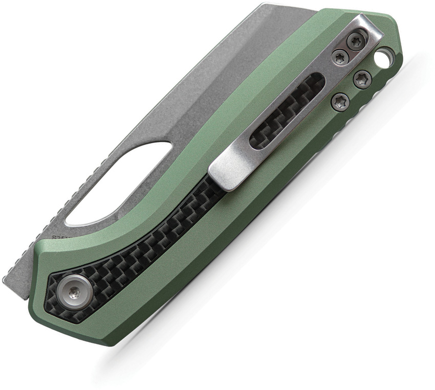 4″ (10.16cm) closed. 3″ (7.62cm) stonewash finish flat ground S35VN stainless sheepsfoot blade. Green aluminum handle with carbon fiber inlay. Thumb pull. Lanyard hole. Pocket clip. Black nylon zippered storage case. Boxed.