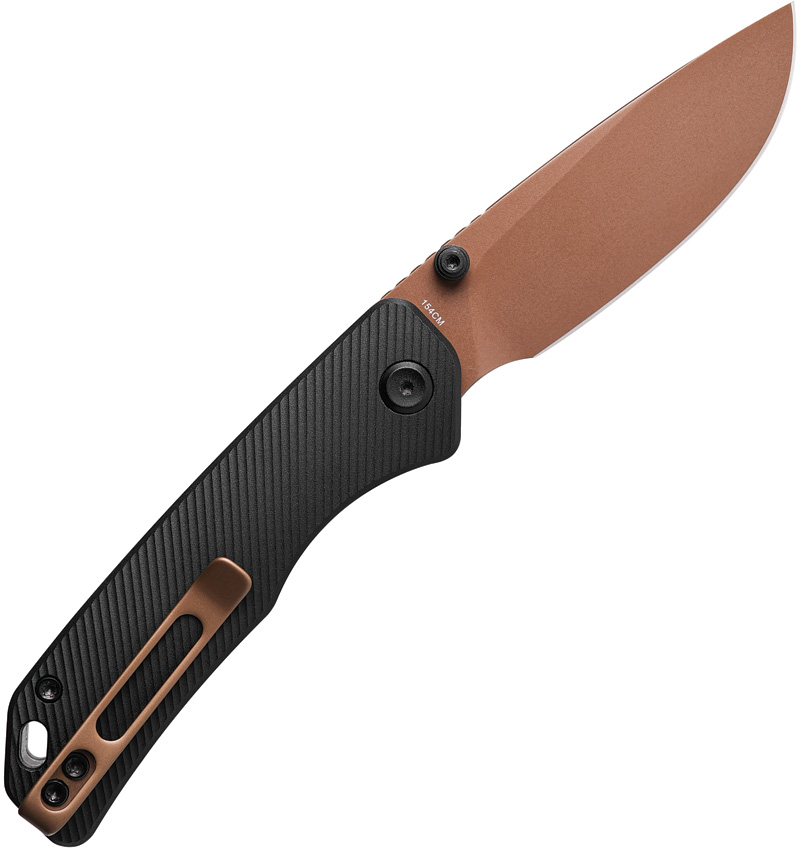 3.88″ (9.86cm) closed. 3″ (7.62cm) 154CM stainless drop point blade. Black fluted aluminum handle. Thumb stud. Lanyard hole. Pocket clip. Copper Dune finish blade. Black nylon zippered storage case. Boxed.