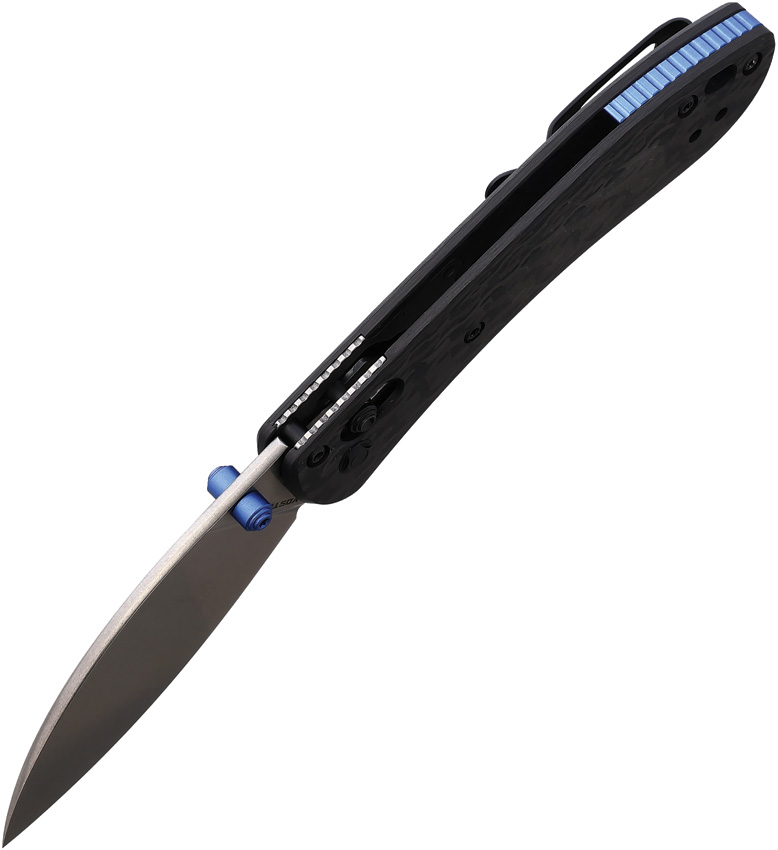 3.75″ (9.53cm) closed. 2.63″ (6.68cm) stonewash finish S35VN stainless blade. Carbon fiber handle. Thumb stud. Lanyard hole. Pocket clip. Shilin cutter style blade. Blue accents. Black nylon zippered storage case. Boxed.