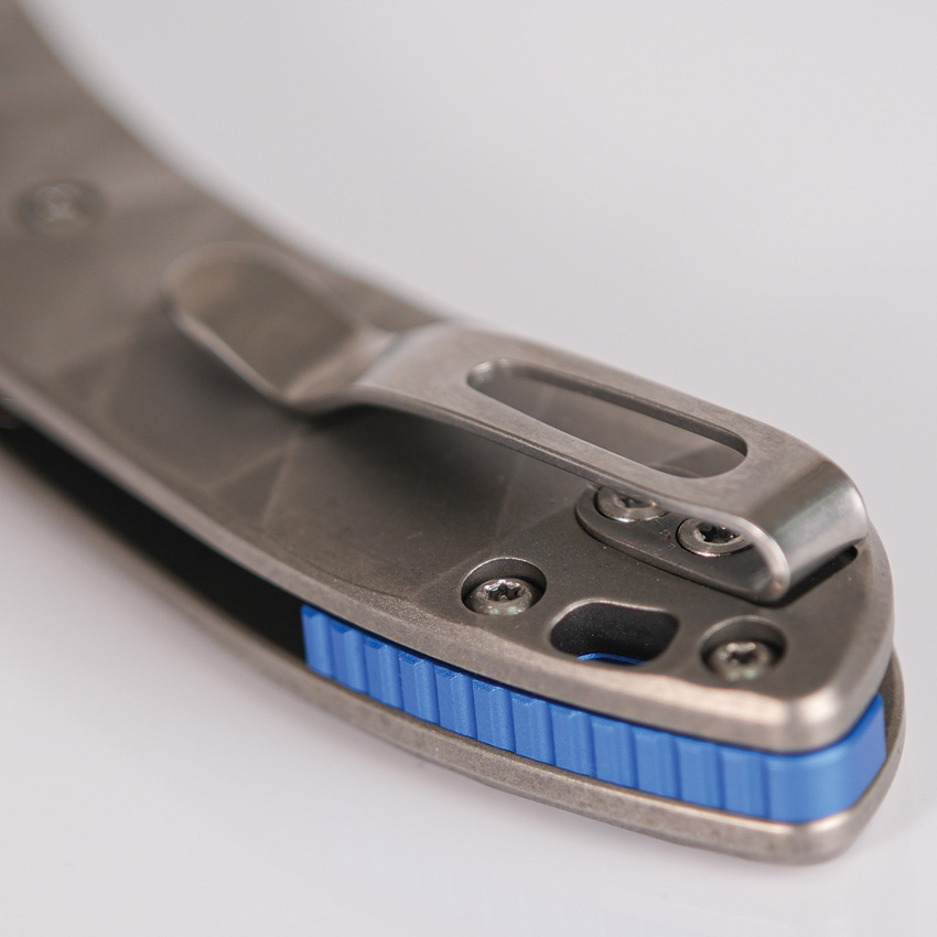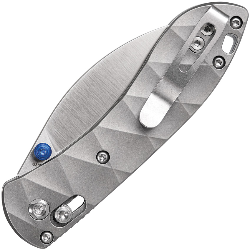 3.75″ (9.53cm) closed. 2.63″ (6.68cm) satin finish S35VN stainless blade. Gray titanium handle. Lanyard hole. Pocket clip. Thumb stud. Black nylon zippered storage case. Boxed.