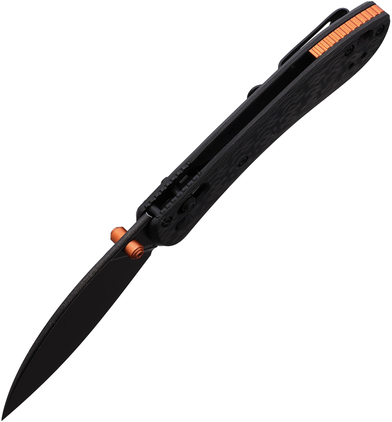 3.75″ (9.53cm) closed. 2.63″ (6.68cm) black stonewash finish S35VN stainless blade. Carbon fiber handle. Thumb stud. Lanyard hole. Pocket clip. Shilin cutter style blade. Orange accents. Black nylon zippered storage case. Boxed.