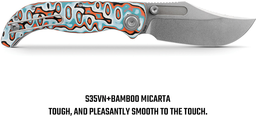 4.5″ (11.43cm) closed. 3.5″ (8.89cm) stonewash finish S35VN stainless clip point blade. Canyon Current bamboo micarta handle. Pocket clip. Thumb stud. Black nylon zippered storage case. Boxed.