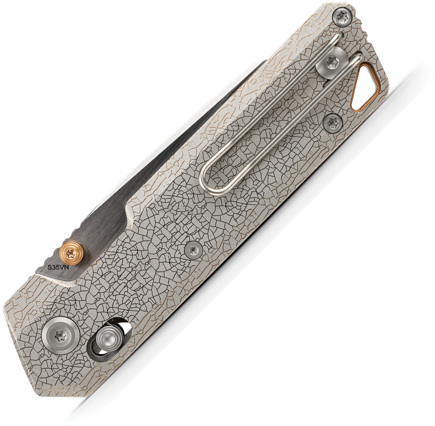 4.13″ (10.49cm) closed. 2.9″ (7.37cm) S35VN stainless reverse tanto blade. Arctic Crackle titanium handle. Thumb stud. Lanyard hole. Pocket clip. Satin and brushed finish blade. Black nylon zippered storage case. Boxed.
