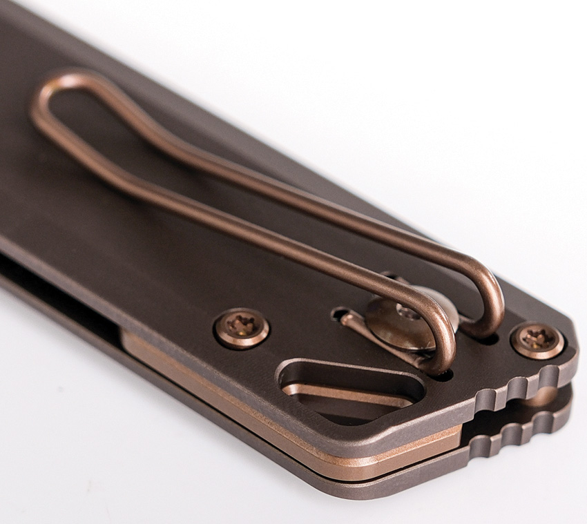 4.13 (10.49cm) closed. 2.9 (7.37cm) copper finish S35VN stainless blade. Copper Dune titanium handle. Thumb stud. Lanyard hole. Pocket clip. Black nylon zippered storage case. Boxed.