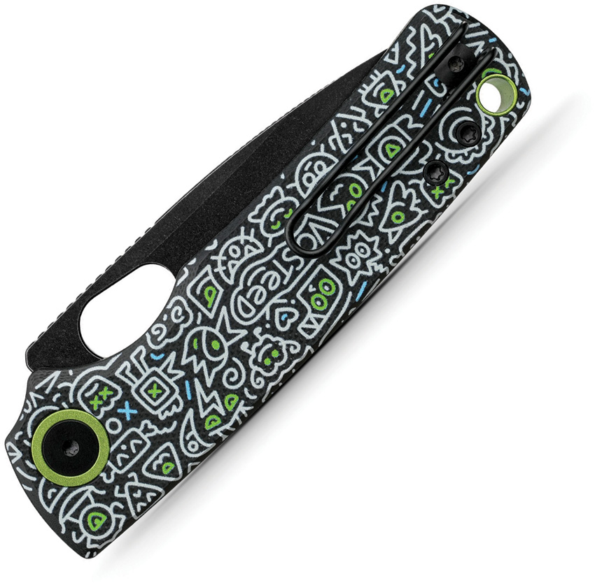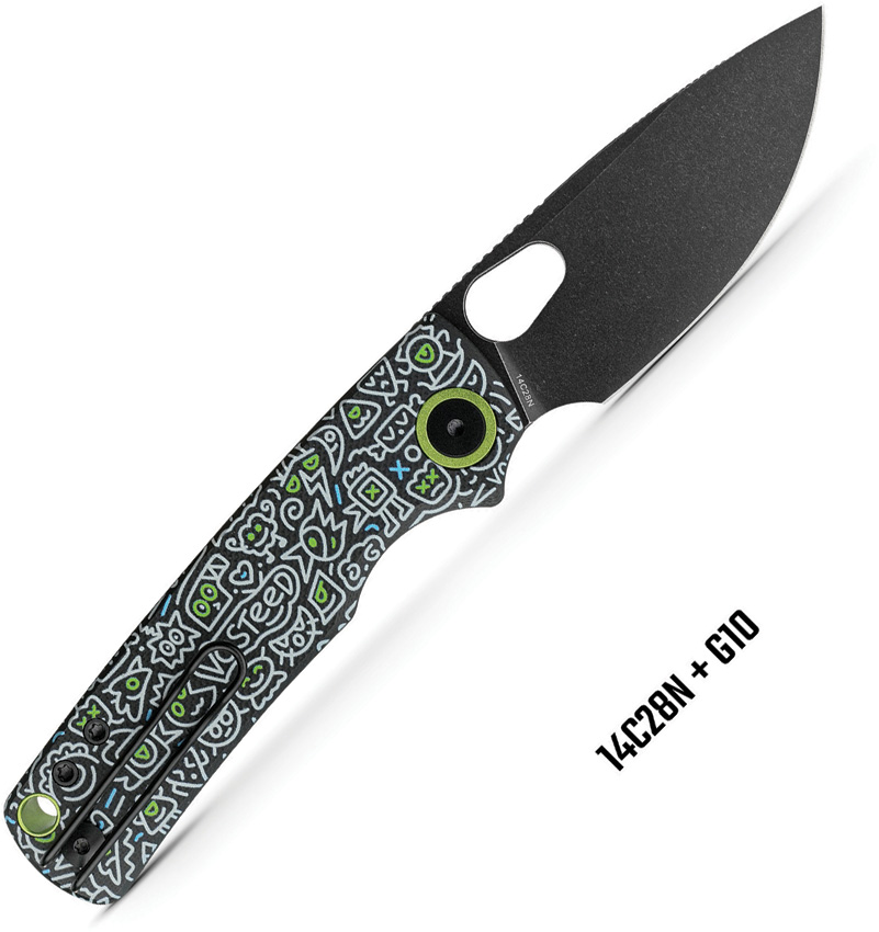 4.13″ (10.49cm) closed. 3″ (7.62cm) black stonewash finish 14C28N Sandvik stainless drop point blade. Black G10 handle. Thumb pull. Lanyard hole. Pocket clip. Doodle Monster handle artwork. Black nylon pouch. Boxed.