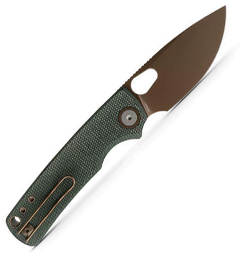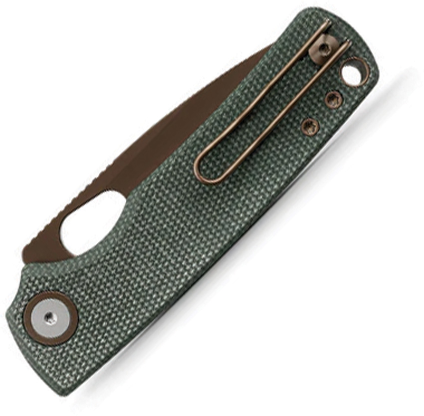 4.13″ (10.49cm) closed. 3″ (7.62cm) 14C28N Sandvik stainless drop point blade. Green canvas micarta handle. Thumb pull. Lanyard hole. Pocket clip. Copper Dune finish blade. Black nylon pouch. Boxed.