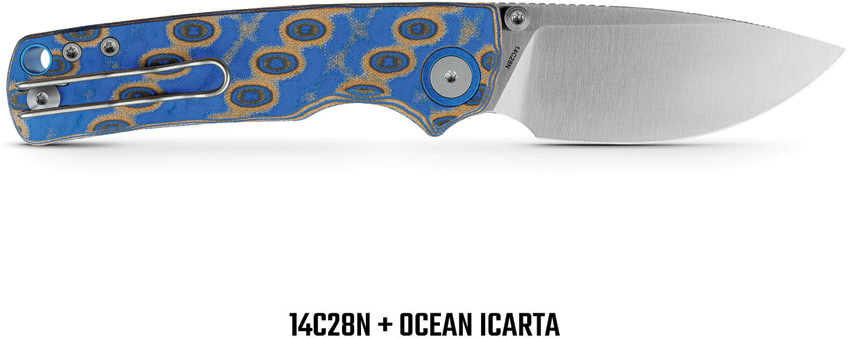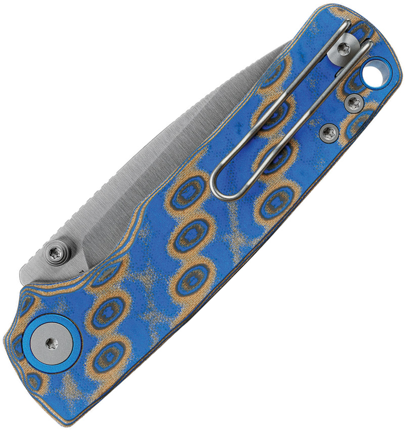 4.13″ (10.49cm) closed. 3″ (7.62cm) satin finish 14C28N Sandvik stainless drop point blade. Blue Ocean micarta handle. Lanyard hole. Pocket clip. Thumb stud. Black nylon pouch. Boxed.
