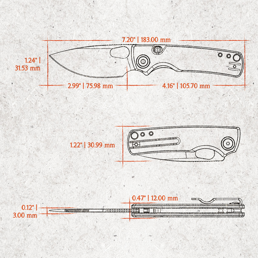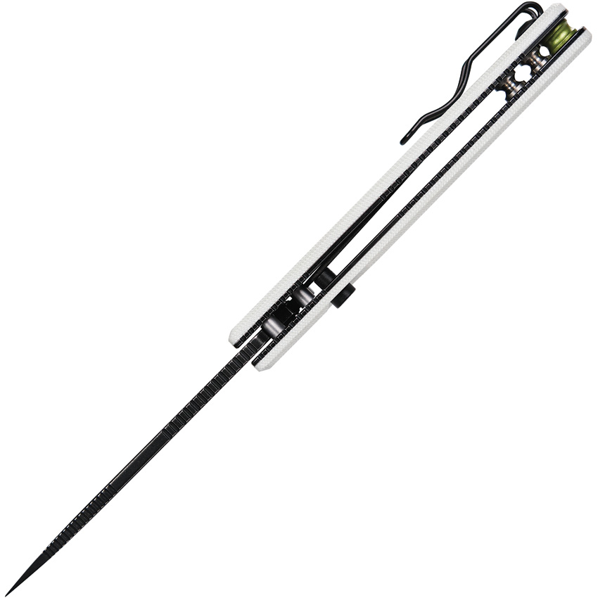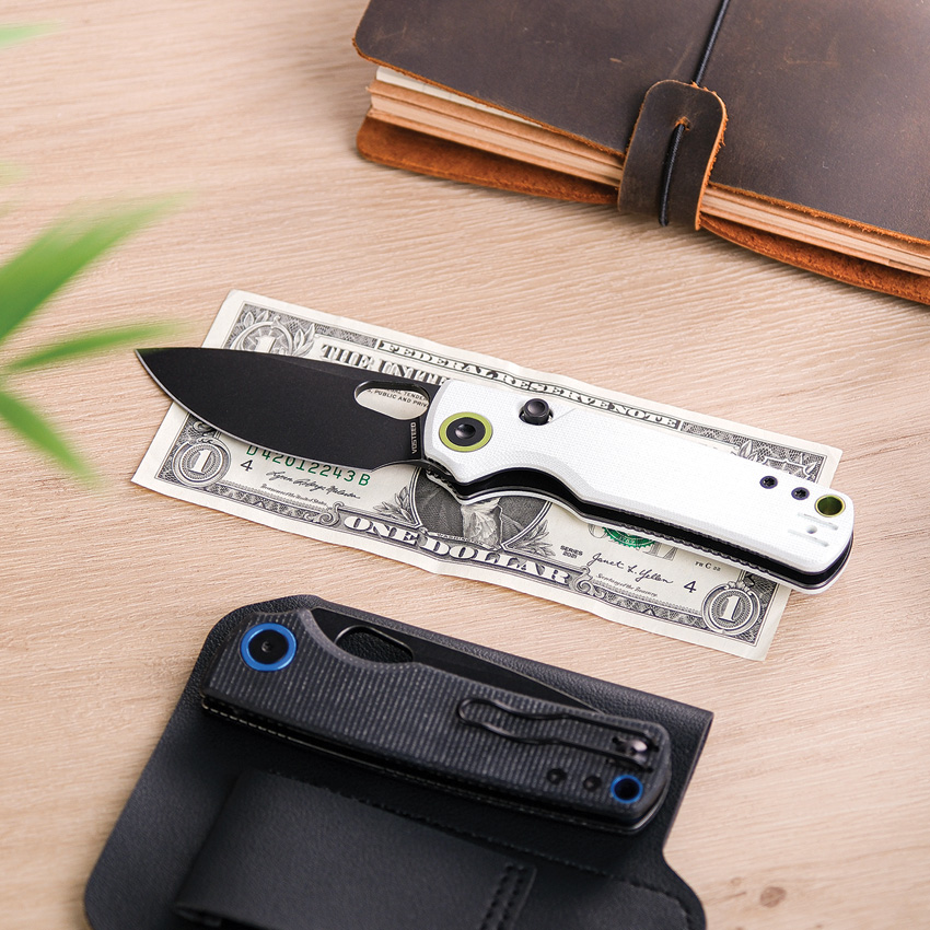 4.13″ (10.49cm) closed. 3″ (7.62cm) black stonewash finish 14C28N Sandvik stainless drop point blade. White G10 handle. Thumb pull. Lanyard hole. Pocket clip. Green accents. Black nylon pouch. Boxed.