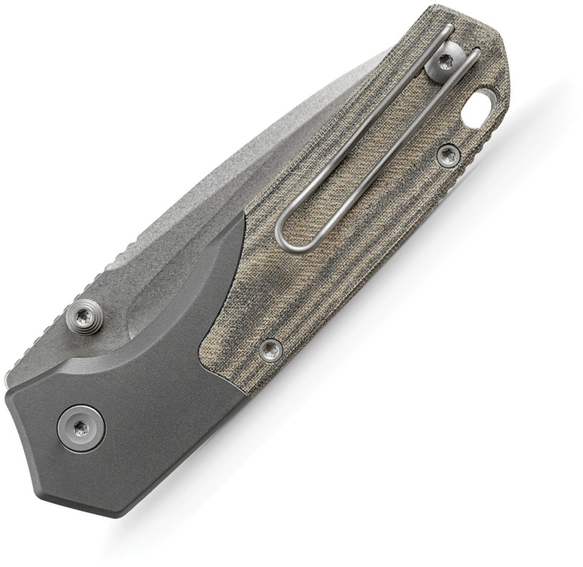 4.25″ (10.8cm) closed. 3″ (7.62cm) stonewash finish S35VN stainless drop point blade. Green Norplex UltreX micarta handle. Titanium bolster(s). Thumb stud. Lanyard hole. Pocket clip. Black nylon zippered storage case. Boxed.