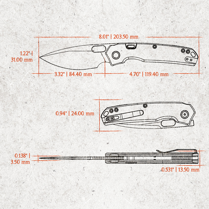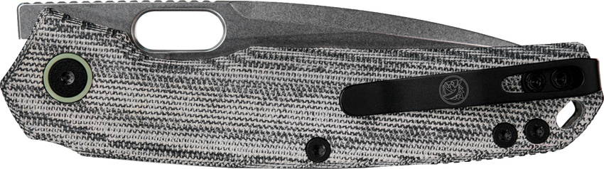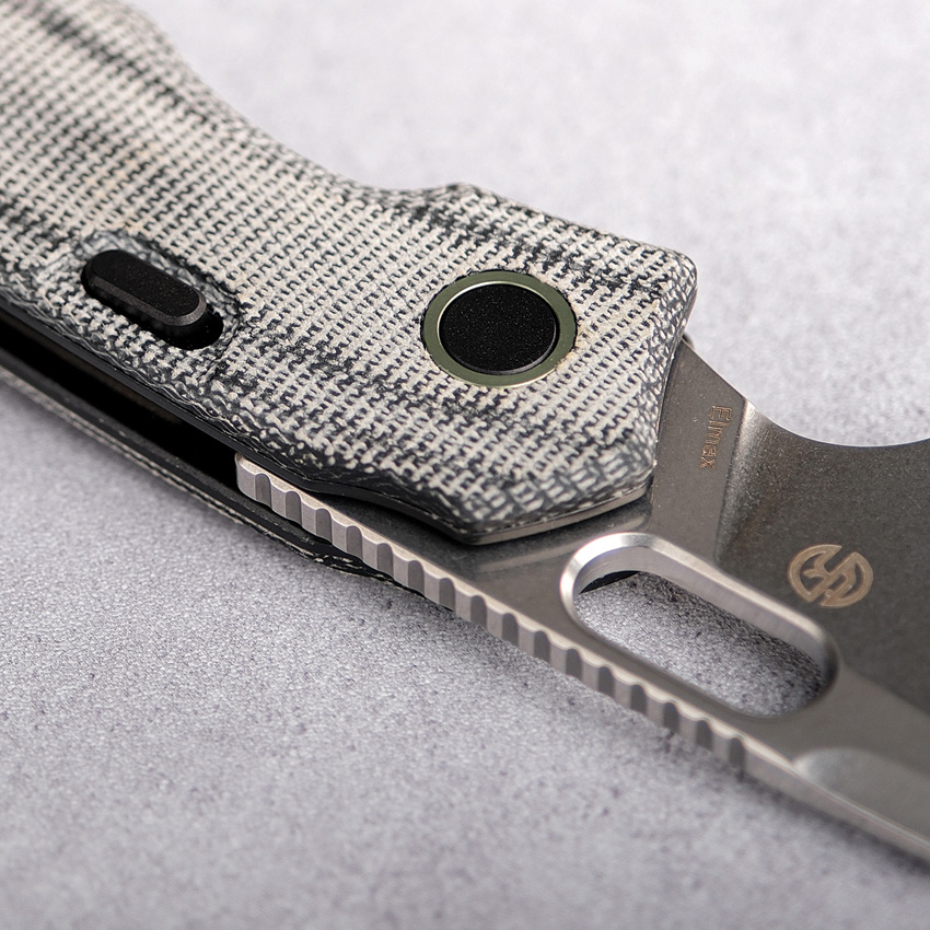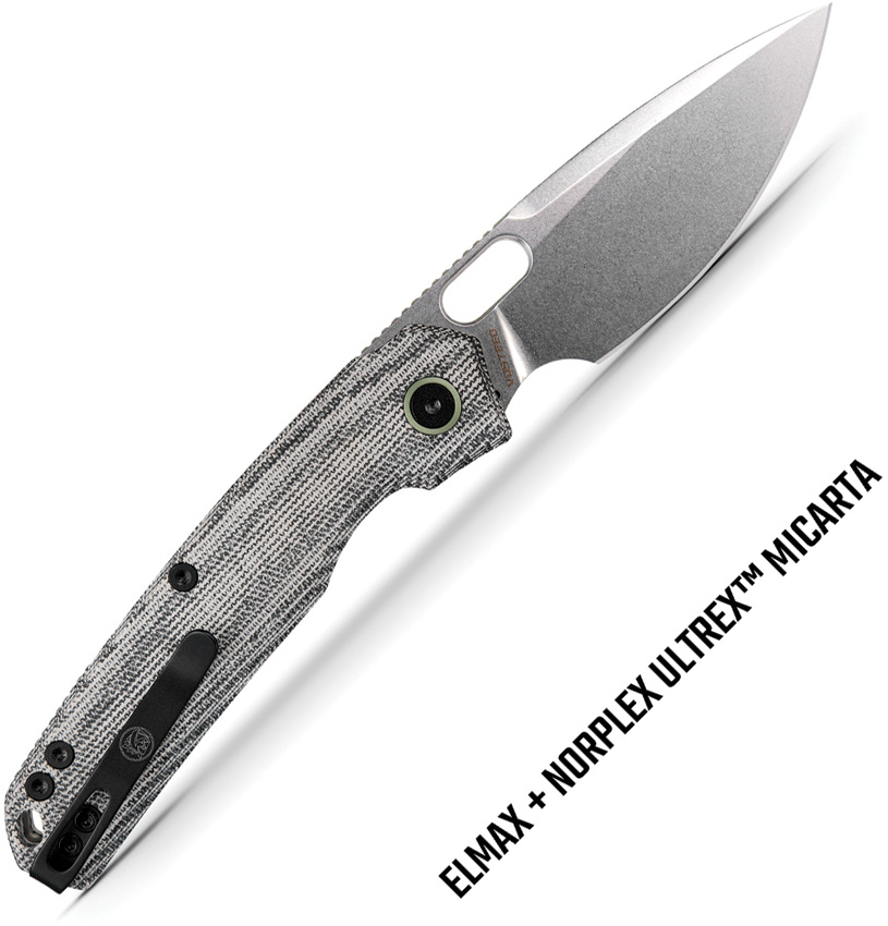 4.75″ (12.07cm) closed. 3.25″ (8.26cm) stonewash finish Elmax steel drop point blade. Black canvas micarta handle. Thumb pull. Lanyard hole. Pocket clip. Extended tang. Black nylon zippered storage case. Boxed.