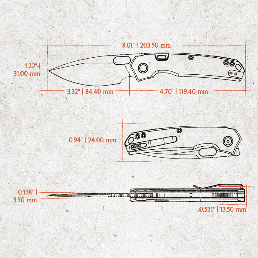 4.75″ (12.07cm) closed. 3.25″ (8.26cm) satin finish Elmax steel drop point blade. Blue Norplex UltreX micarta handle. Thumb pull. Lanyard hole. Pocket clip. Extended tang. Black nylon zippered storage case. Boxed.