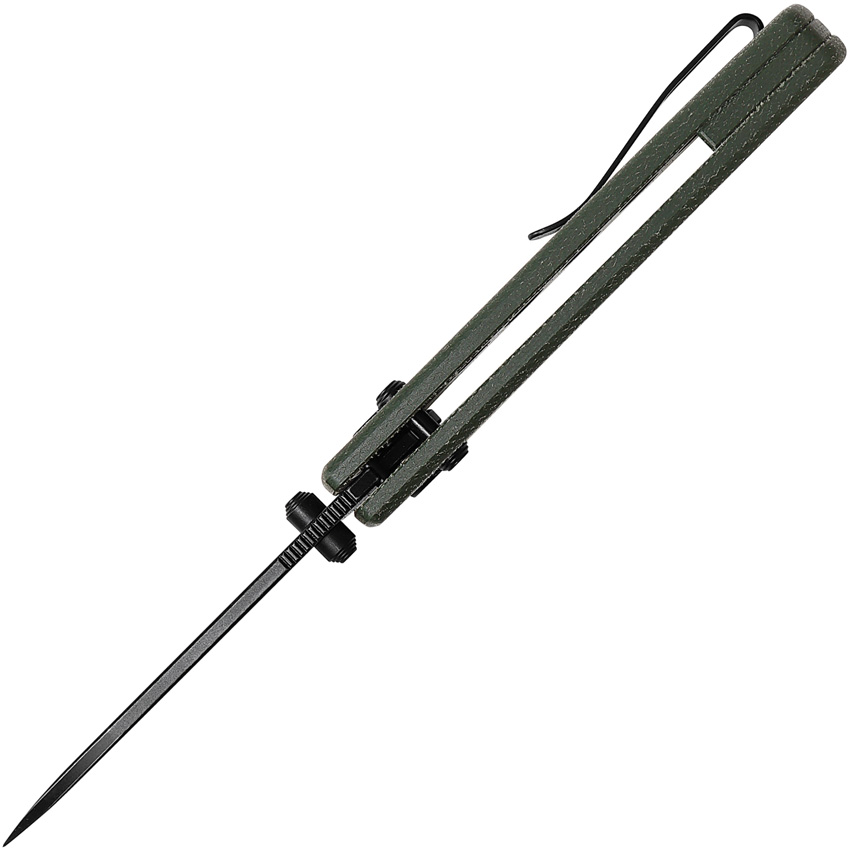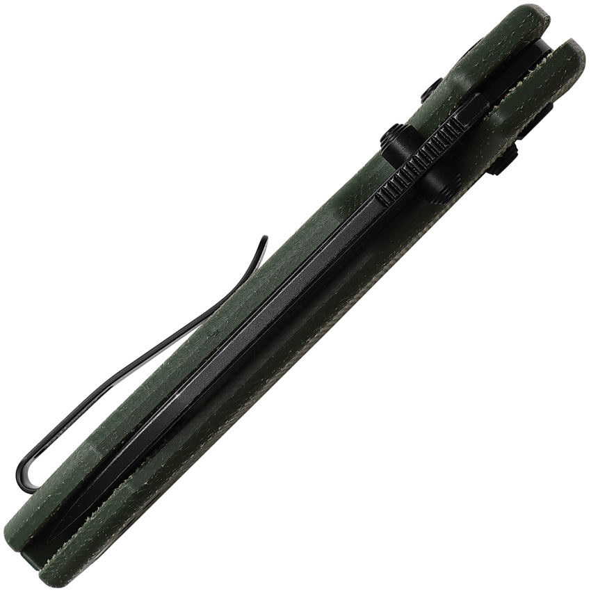 4.38″ (11.13cm) closed. 3.25″ (8.26cm) black stonewash finish 14C28N Sandvik stainless drop point blade. Green canvas micarta handle. Thumb stud. Lanyard hole. Pocket clip. Boxed.