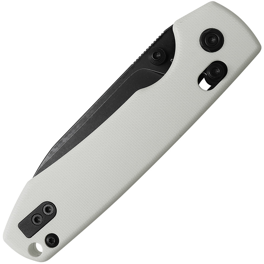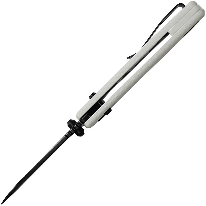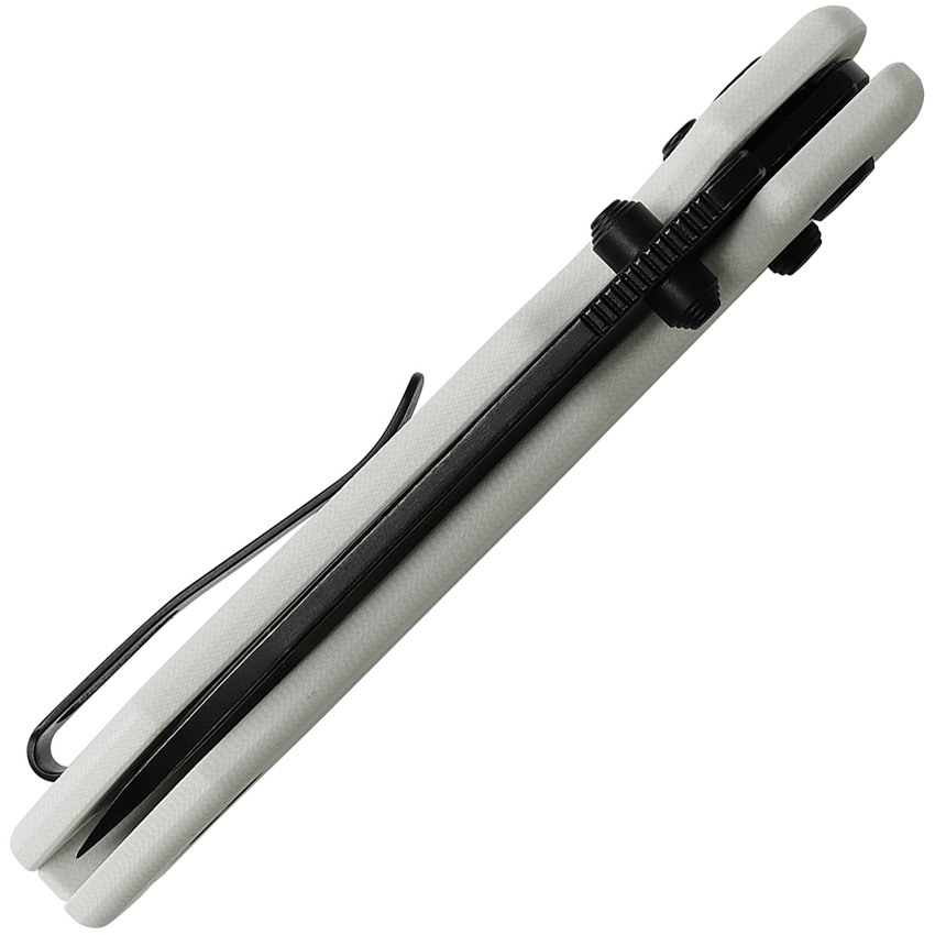4.38″ (11.13cm) closed. 3.25″ (8.26cm) black stonewash finish 14C28N Sandvik stainless drop point blade. White G10 handle. Thumb stud. Lanyard hole. Pocket clip. Boxed.