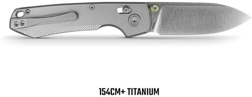 4.38″ (11.13cm) closed. 3.25″ (8.26cm) sand blast finish 154CM stainless blade. Gray titanium handle. Thumb stud. Lanyard hole. Pocket clip. Black nylon zippered storage case. Boxed.