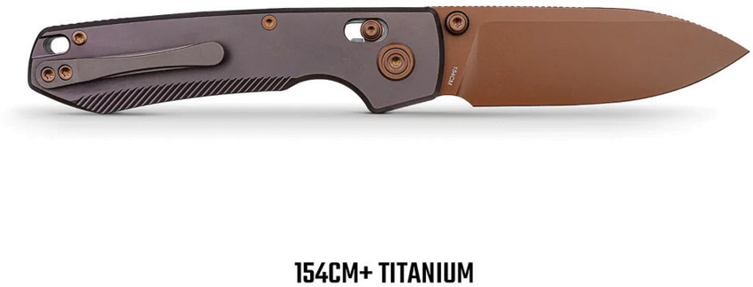 4.38″ (11.13cm) closed. 3.25″ (8.26cm) 154CM stainless drop point blade. Titanium handle. Thumb stud. Lanyard hole. Pocket clip. Copper Dune finish blade. Reddish purple handle. Black nylon zippered storage case. Boxed.