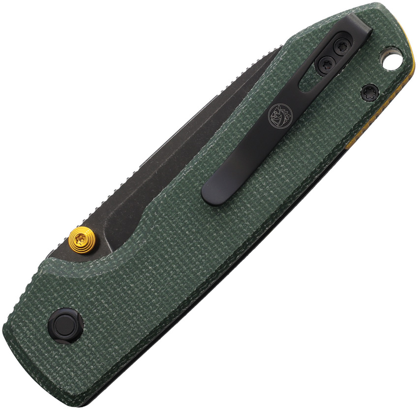 4.38″ (11.13cm) closed. 3.25″ (8.26cm) black stonewash finish 14C28N Sandvik stainless blade. Green canvas micarta handle. Thumb stud. Lanyard hole. Pocket clip. Black nylon zippered storage case. Boxed.