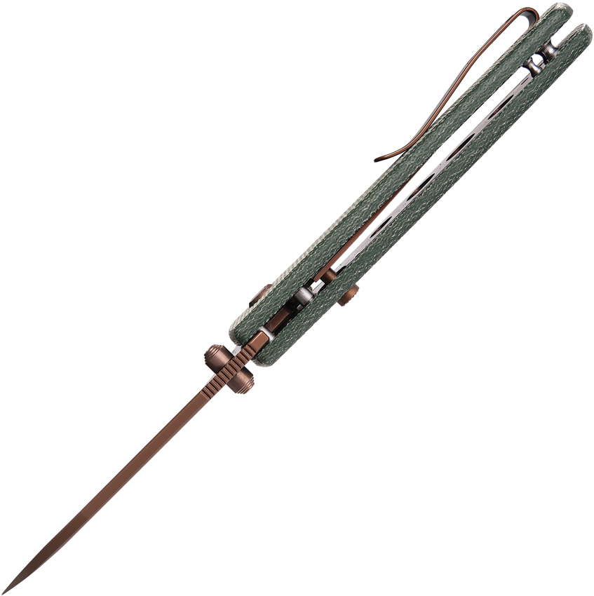 4.38″ (11.13cm) closed. 3.25″ (8.26cm) 14C28N Sandvik stainless blade. Green micarta handle. Thumb stud. Lanyard hole. Pocket clip. Copper Dune finish blade. Black nylon zippered storage case. Boxed.