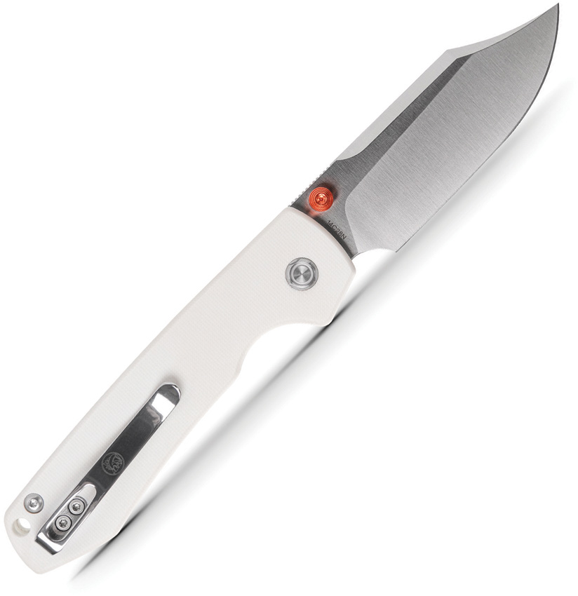 4.38″ (11.13cm) closed. 3.25″ (8.26cm) satin finish 14C28N Sandvik stainless bowie blade. White G10 handle. Thumb stud. Lanyard hole. Pocket clip. Black nylon zippered storage case. Boxed.