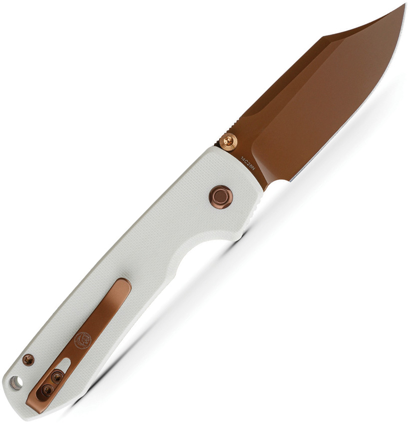 4.38″ (11.13cm) closed. 3.25″ (8.26cm) 14C28N Sandvik stainless clip point blade. White G10 handle. Thumb stud. Lanyard hole. Pocket clip. Copper Dune finish blade. Black nylon zippered storage case. Boxed.
