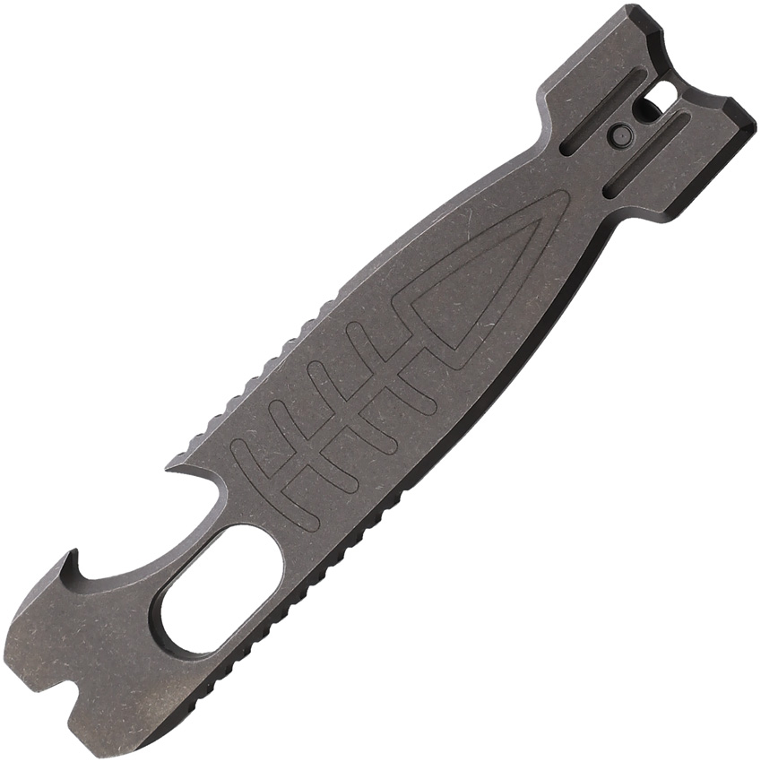 3.3″ closed. Tools include: Pry bar l Bottle opener l Keyring l Pocket clip. Staple and nail puller I Hex wrench (3/16, 5/32, 3/32, 5/64). Shark bomb shape with fish bone laser-etched pattern. 3/16″ Grade 5 TC4 titanium construction. Boxed.