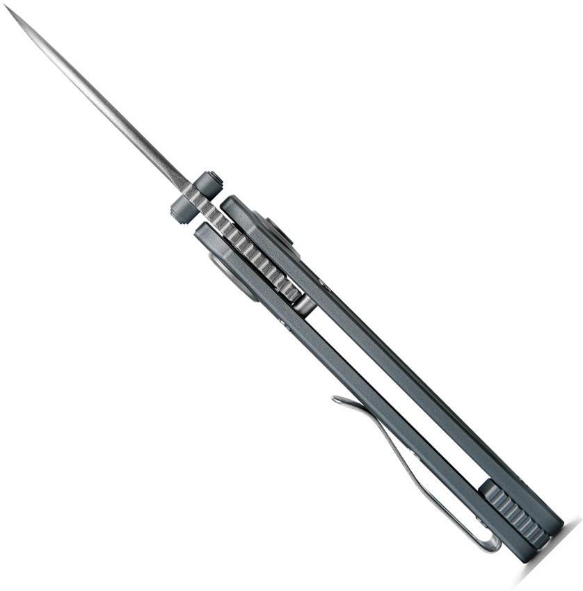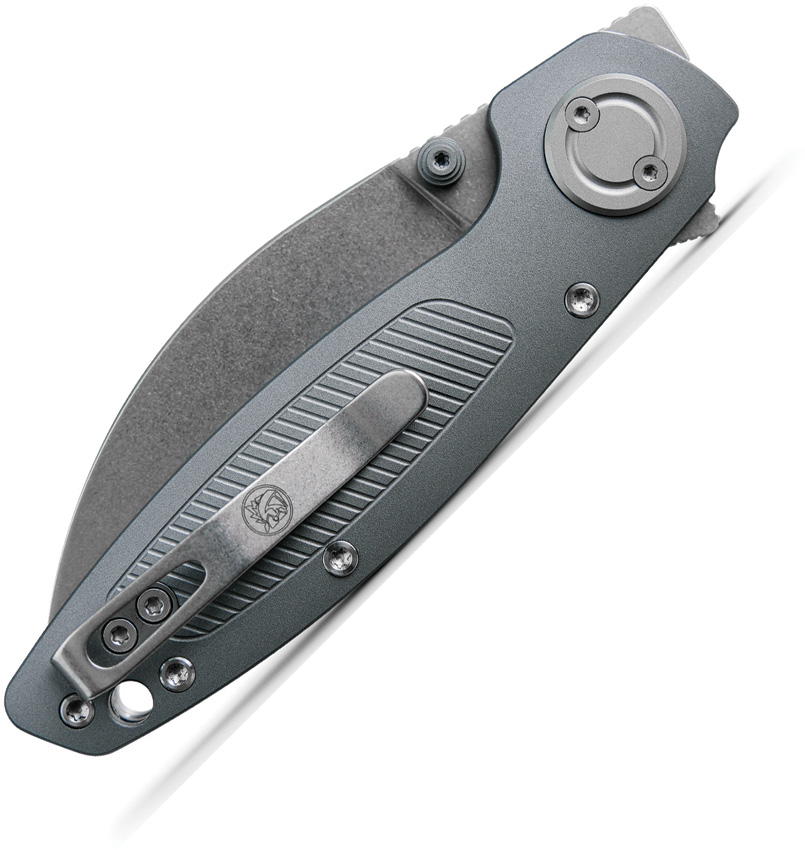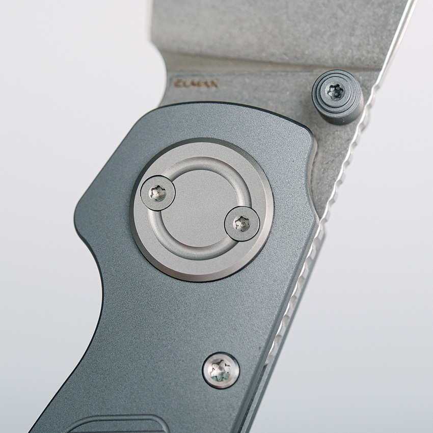4.13″ (10.49cm) closed. 2.9″ (7.37cm) stonewash finish Elmax steel blade. Gray aluminum handle. Thumb stud. Lanyard hole. Pocket clip. Extended tang. Left hand version. Black nylon zippered storage case. Boxed.