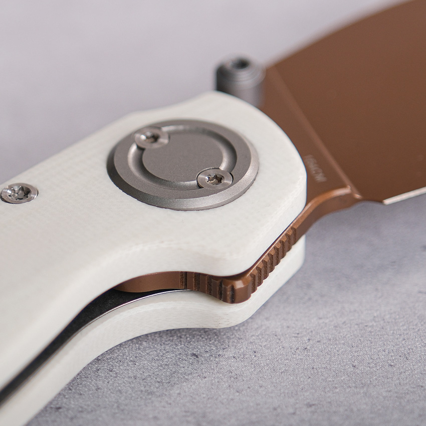 4.13″ (10.49cm) closed. 2.9″ (7.37cm) 154CM stainless blade. Norplex UltreX G10 handle. Thumb stud. Lanyard hole. Pocket clip. Extended tang. Copper Dune finish blade. Black nylon zippered storage case. Boxed.