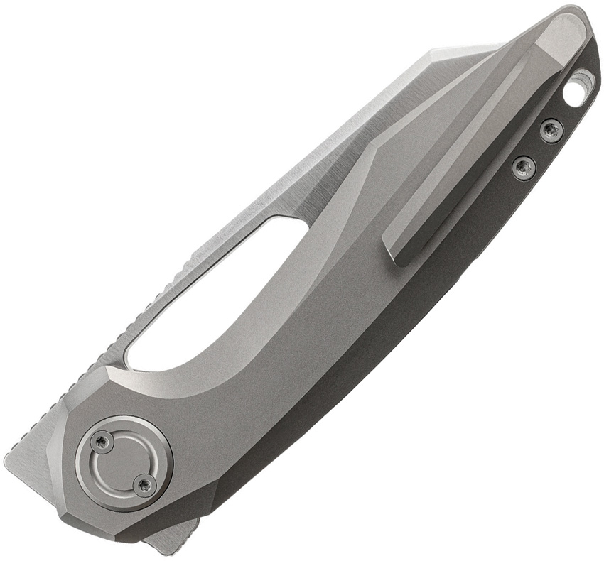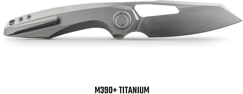 4.75″ (12.07cm) closed. 3.5″ (8.89cm) satin finish Bohler M390 stainless reverse tanto blade. Gray titanium handle. Extended tang. Thumb pull. Lanyard hole. Pocket clip. Boxed.