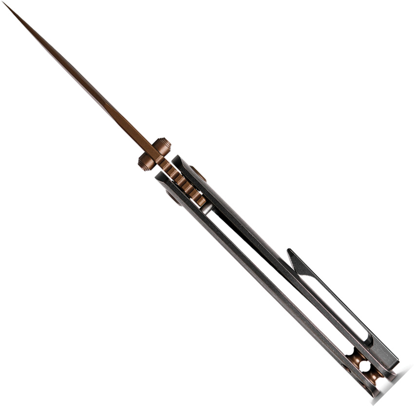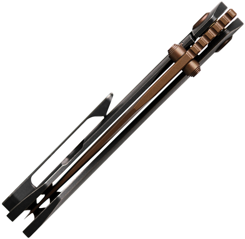 3.88″ (9.86cm) closed. 3″ (7.62cm) S35VN stainless clip point blade. Black stonewash finish titanium handle. Thumb stud. Pocket clip. Extended tang. Copper Dune finish blade. Boxed.