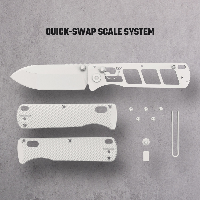 3.88″ (9.86cm) closed. 2.88″ (7.32cm) satin finish Bohler M390 stainless bowie blade. Gray sculpted aluminum handle. Thumb stud. Pocket clip. Quick-Swap scale system. Ball roll bar. Boxed.