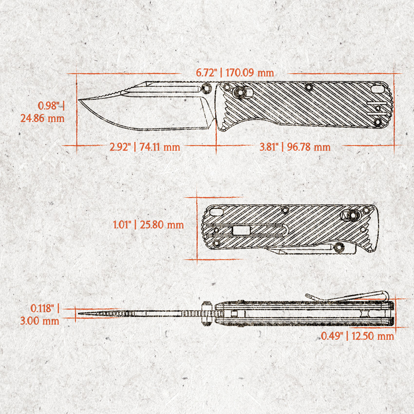 3.88″ (9.86cm) closed. 2.88″ (7.32cm) black stonewash finish Bohler M390 stainless bowie blade. Olive sculpted aluminum handle. Thumb stud. Pocket clip. Quick-Swap scale system. Ball roll bar. Boxed.