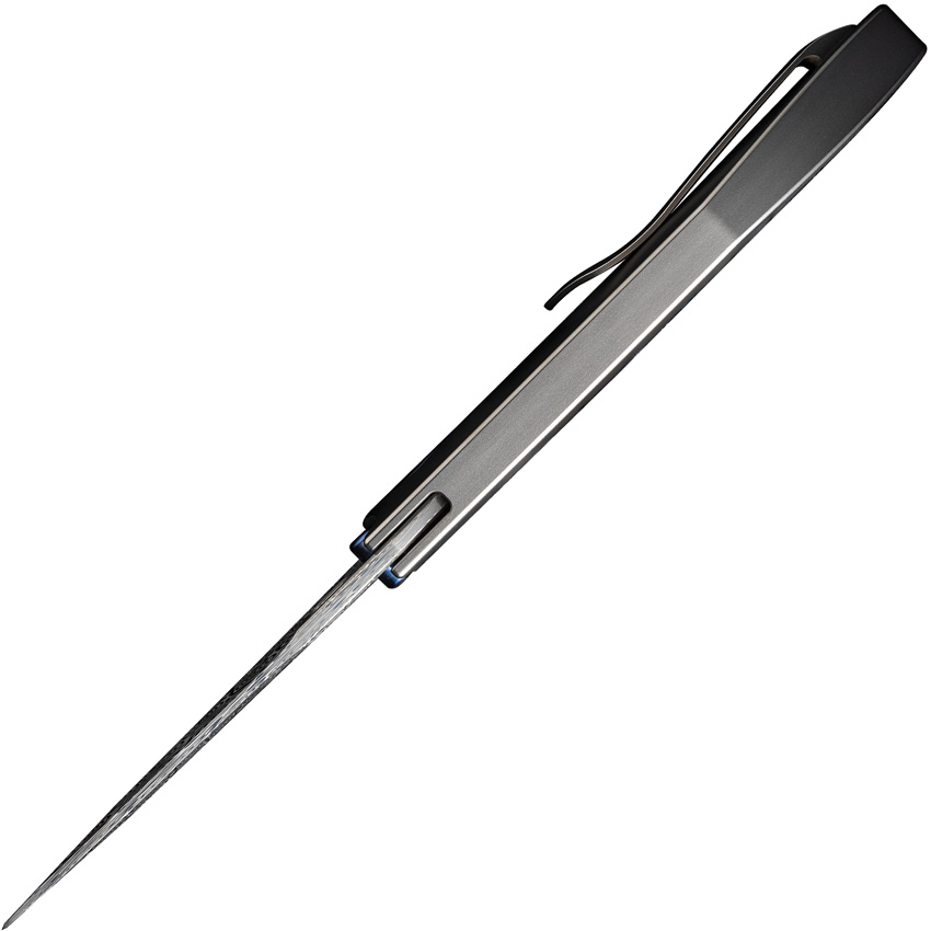 4.88″ (12.4cm) closed. 3.5″ (8.89cm) Damasteel blade. Bead blast finish titanium handle. Extended tang. Thumb stud. Thumb pull. Pocket clip. Flame anodized accents. Black nylon zippered storage case. Boxed.