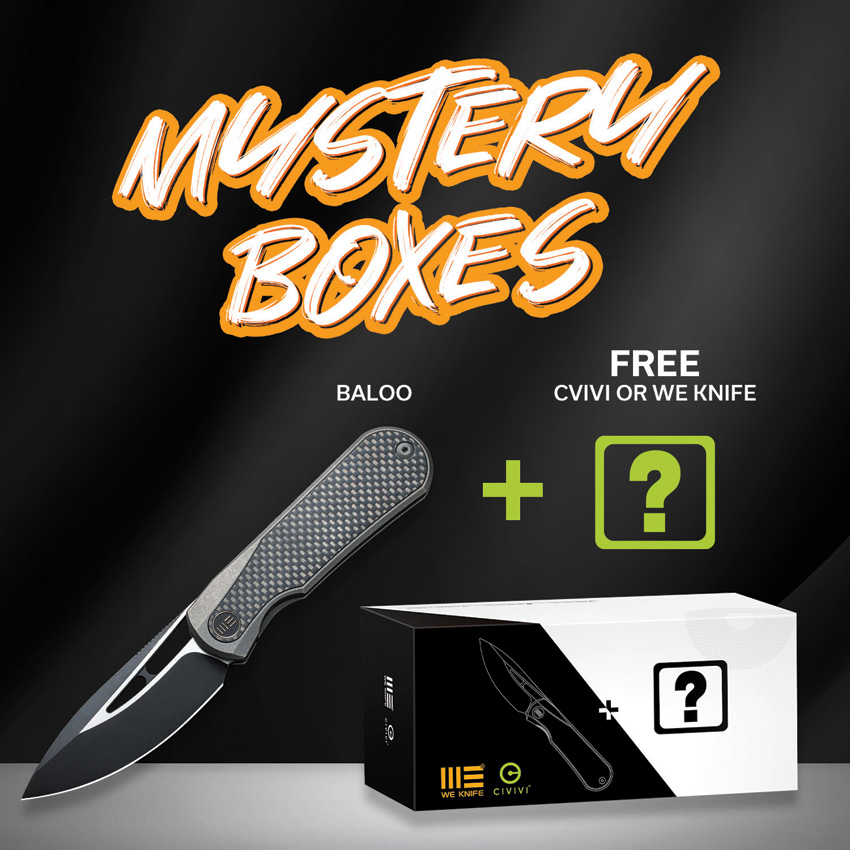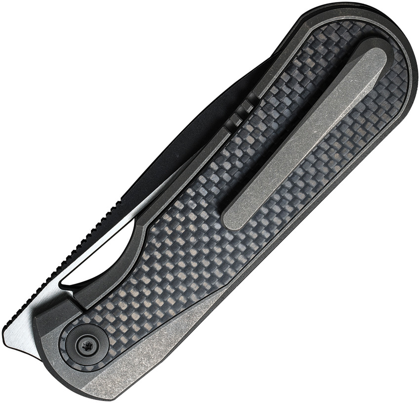 4.5″ (11.43cm) closed. 3.25″ (8.26cm) two-tone finish CPM-20CV stainless drop point blade. Gray titanium handle with Twill carbon fiber inlay. Thumb pull. Pocket clip. Comes with one free mystery WE or CIVIVI model. Boxed.