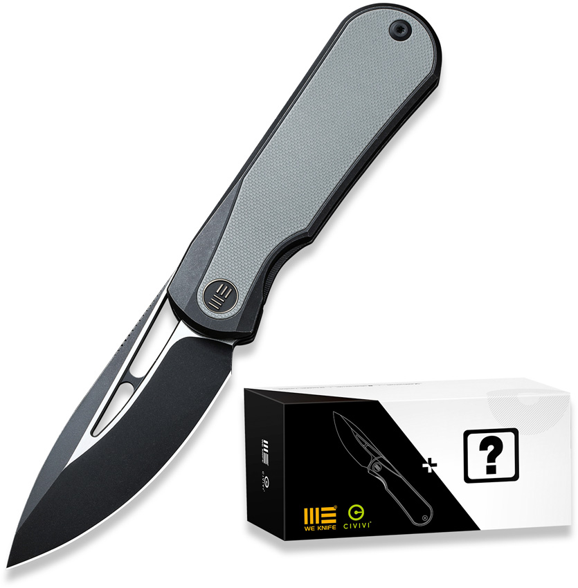 4.5″ (11.43cm) closed. 3.25″ (8.26cm) two-tone finish CPM-20CV stainless drop point blade. Black titanium handle with Gray G10 inlay. Thumb pull. Pocket clip. Comes with one free mystery WE or CIVIVI model. Boxed.
