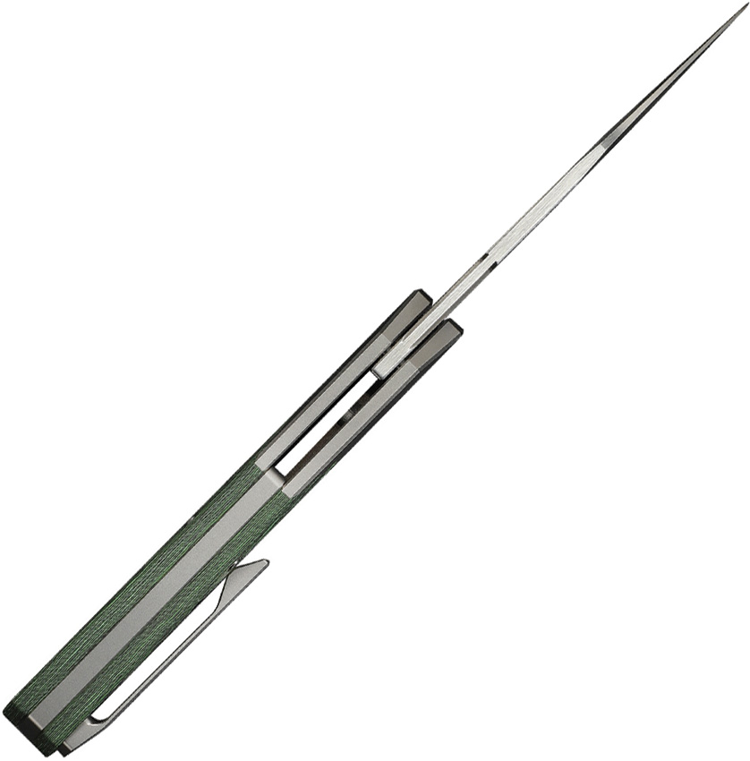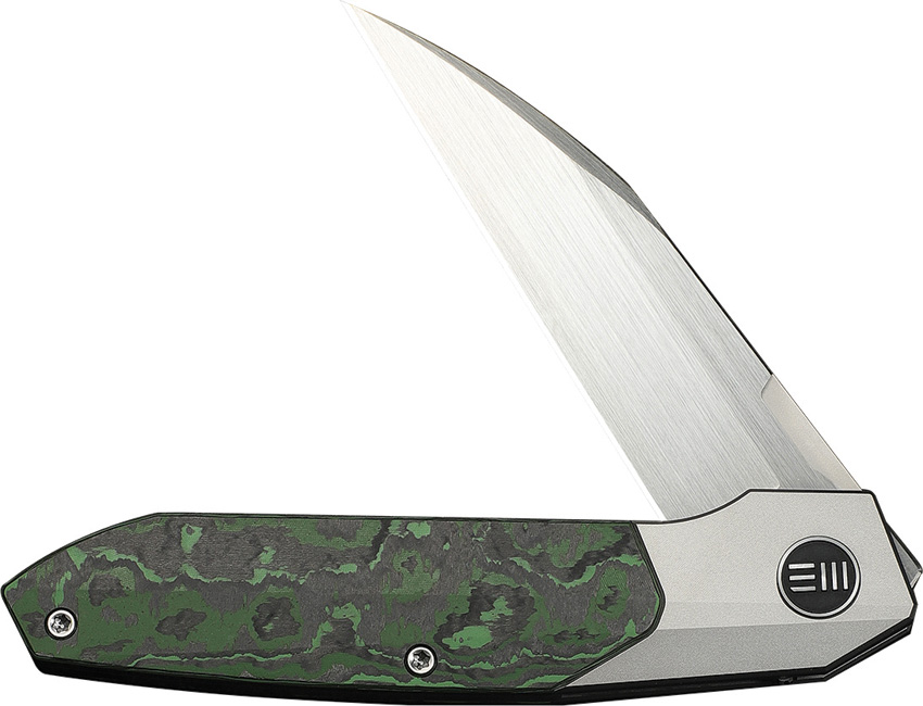 4.38″ (11.13cm) closed. 3.25″ (8.26cm) satin finish Bohler M390 stainless Wharncliffe blade. Gray titanium handle with Jungle Wear Fat carbon fiber inlay. Extended tang. Pocket clip. Black nylon zippered storage case. Boxed.