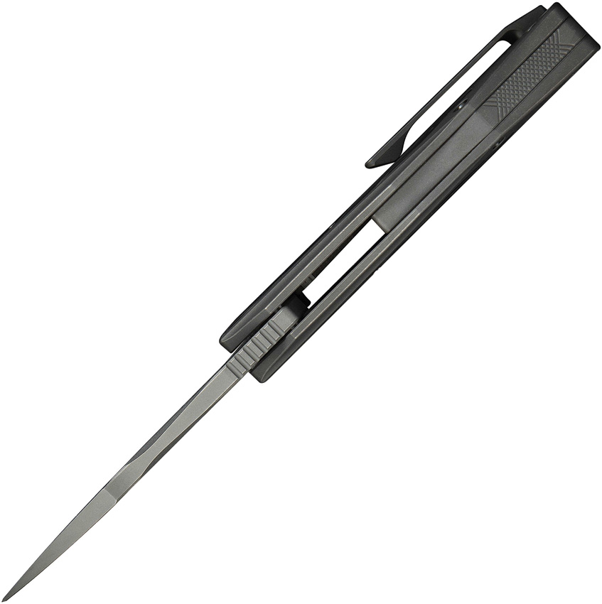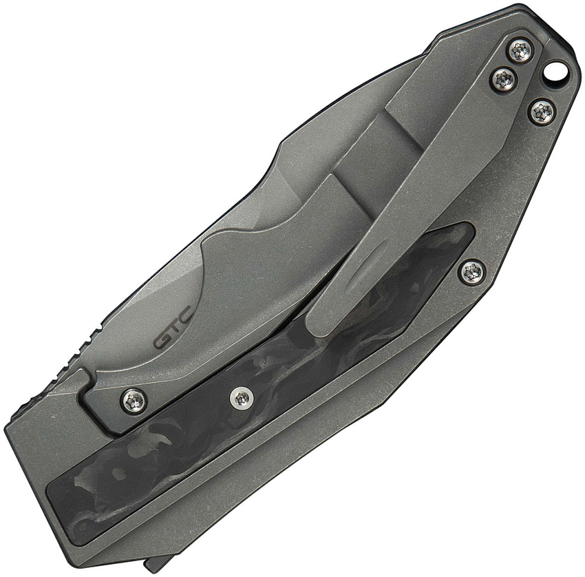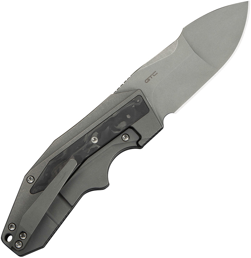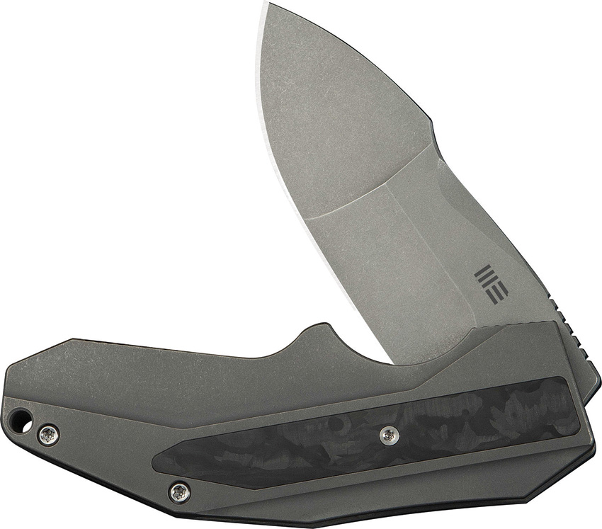 4″ (10.16cm) closed. 3″ (7.62cm) stonewash finish CPM-20CV stainless spear point blade. Gray titanium handle with marble carbon fiber inlay. Extended tang. Pocket clip. Lanyard hole. Compound ground blade. Black nylon pouch. Boxed.