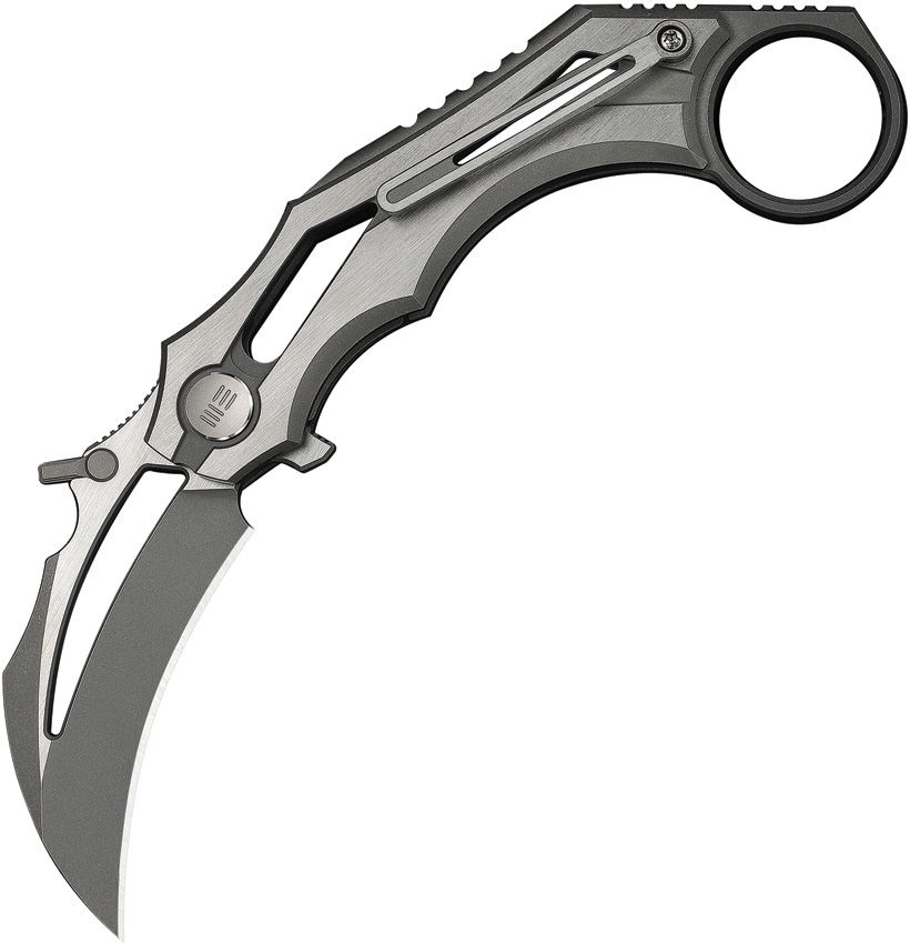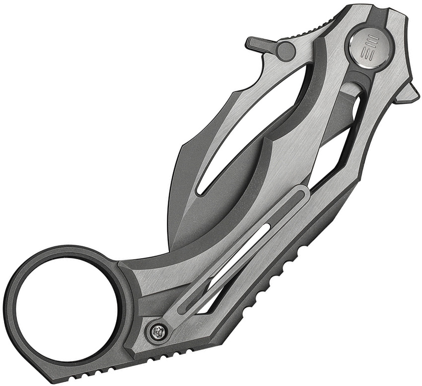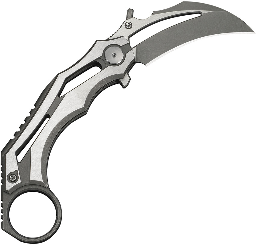 4.63″ (11.76cm) closed. 2″ (5.08cm) gray stonewash finish Bohler M390 stainless hawkbill blade. Gray and satin titanium handle. Extended tang. Finger ring. Thumb disk. Pocket clip. Black nylon zippered storage case. Boxed.