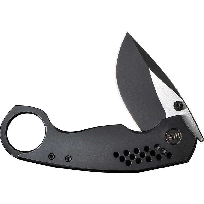 4.88″ (12.4cm) closed. 2.38″ (6.05cm) black stonewash and satin finish CPM-20CV stainless drop point blade. Black stonewash finish titanium handle. Extended tang. Finger ring. Pocket clip. Thumb stud. Black nylon belt sheath. Boxed.