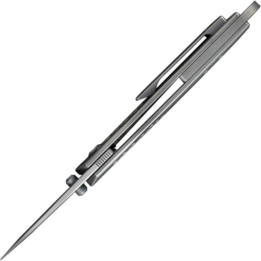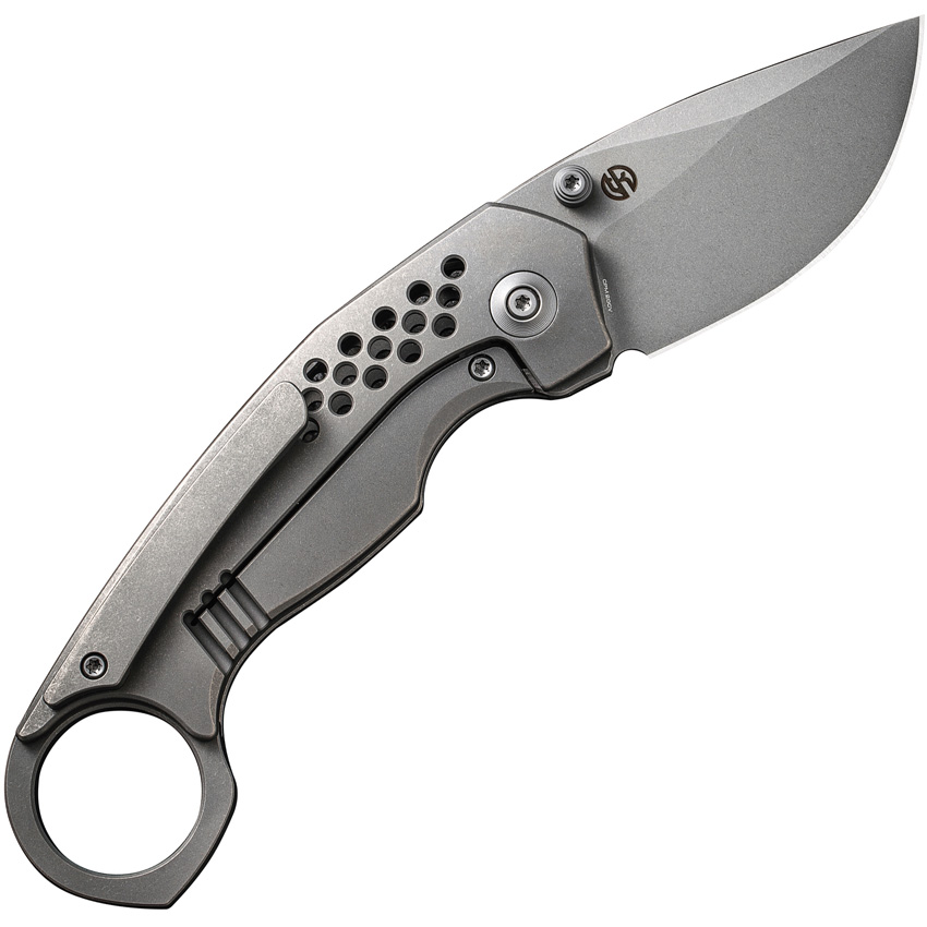 4.88″ (12.4cm) closed. 2.38″ (6.05cm) stonewash finish CPM-20CV stainless drop point blade. Stonewash finish titanium handle. Finger ring. Extended tang. Thumb stud. Pocket clip. Black nylon belt sheath. Boxed.