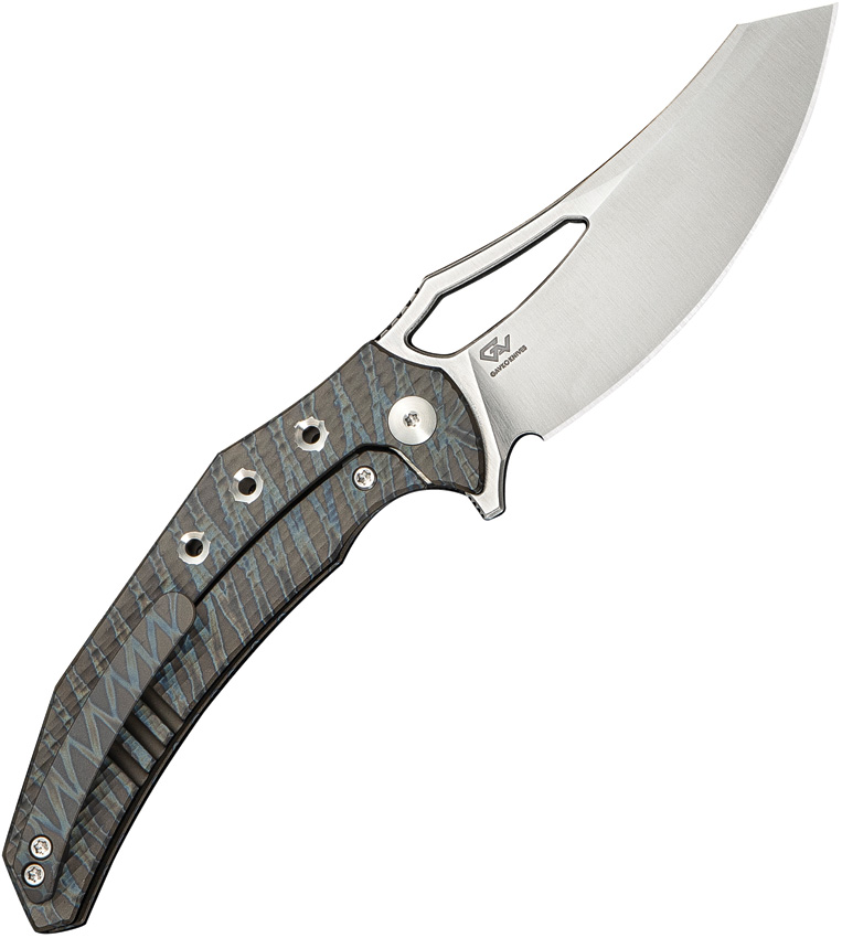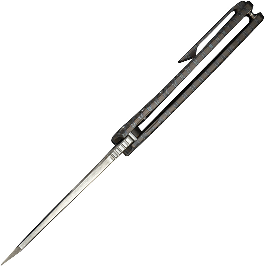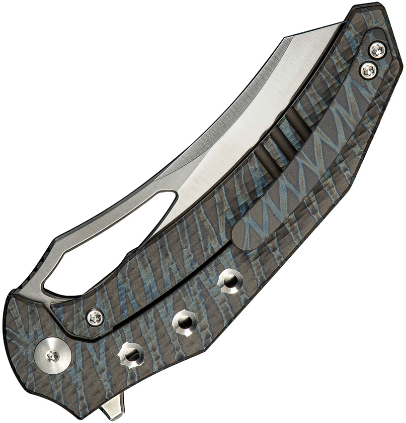 4.38″ (11.13cm) closed. 3.5″ (8.89cm) satin finish Bohler M390 stainless blade. Tiger striped anodized titanium handle. Extended tang. Thumb pull. Pocket clip. Black Kydex belt sheath. Boxed.