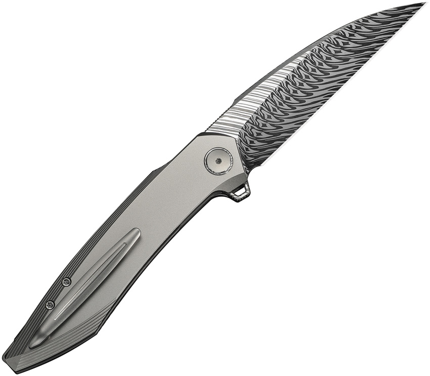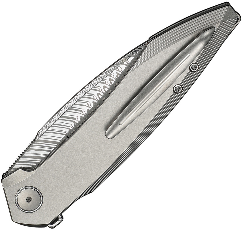 5″ (12.7cm) closed. 4″ (10.16cm) Damasteel Wharncliffe blade. Bead blast finish titanium handle. Extended tang. Pocket clip. Black nylon zippered storage case. Boxed.