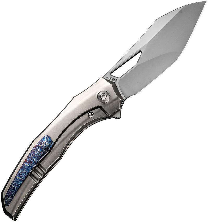 4.38″ (11.13cm) closed. 3.38″ (8.59cm) bead blast finish CPM-20CV stainless blade. Bead blast finish titanium handle. Extended tang. Thumb pull. Wharnto (Wharncliffe/tanto) blade. Timascus pocket clip. Black nylon zippered storage case. Boxed.