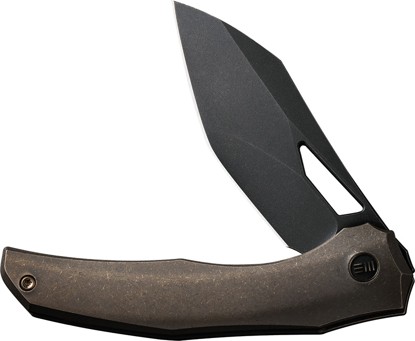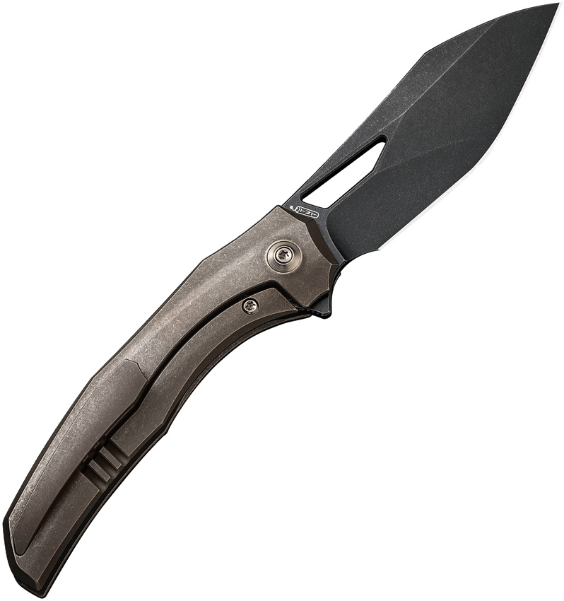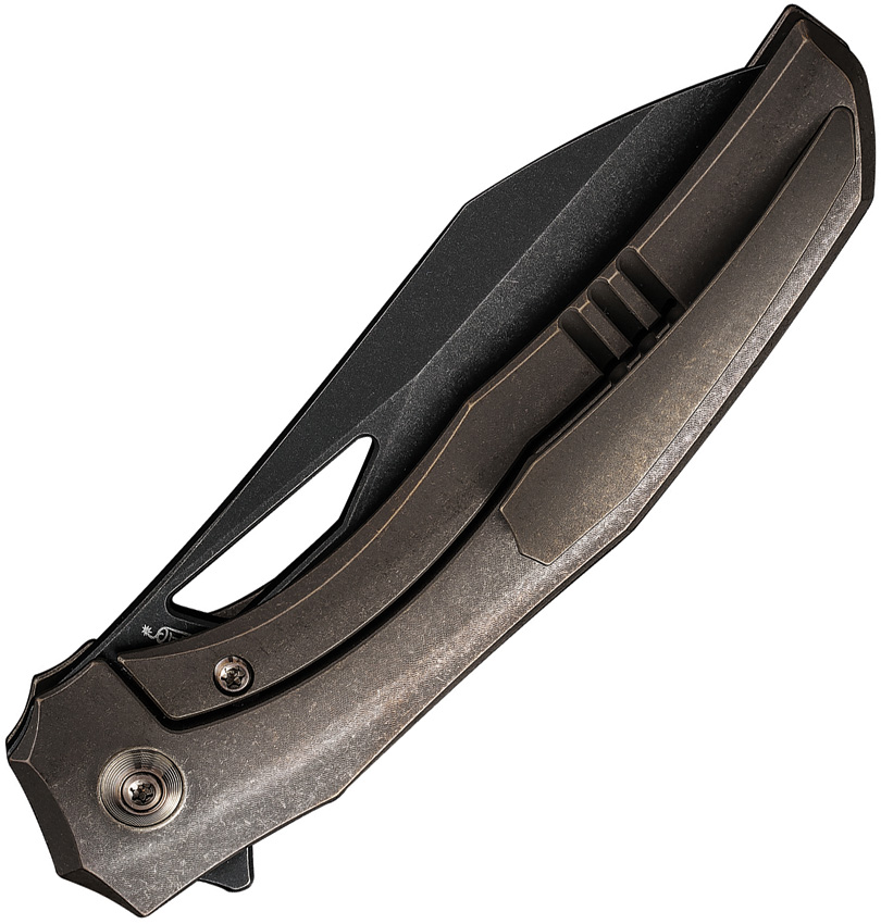 4.38″ (11.13cm) closed. 3.38″ (8.59cm) black stonewash finish CPM-20CV stainless blade. Bronze stonewash finish titanium handle. Extended tang. Pocket clip. Thumb pull. Wharnto (Wharncliffe/tanto) blade. Black nylon zippered storage case. Boxed.