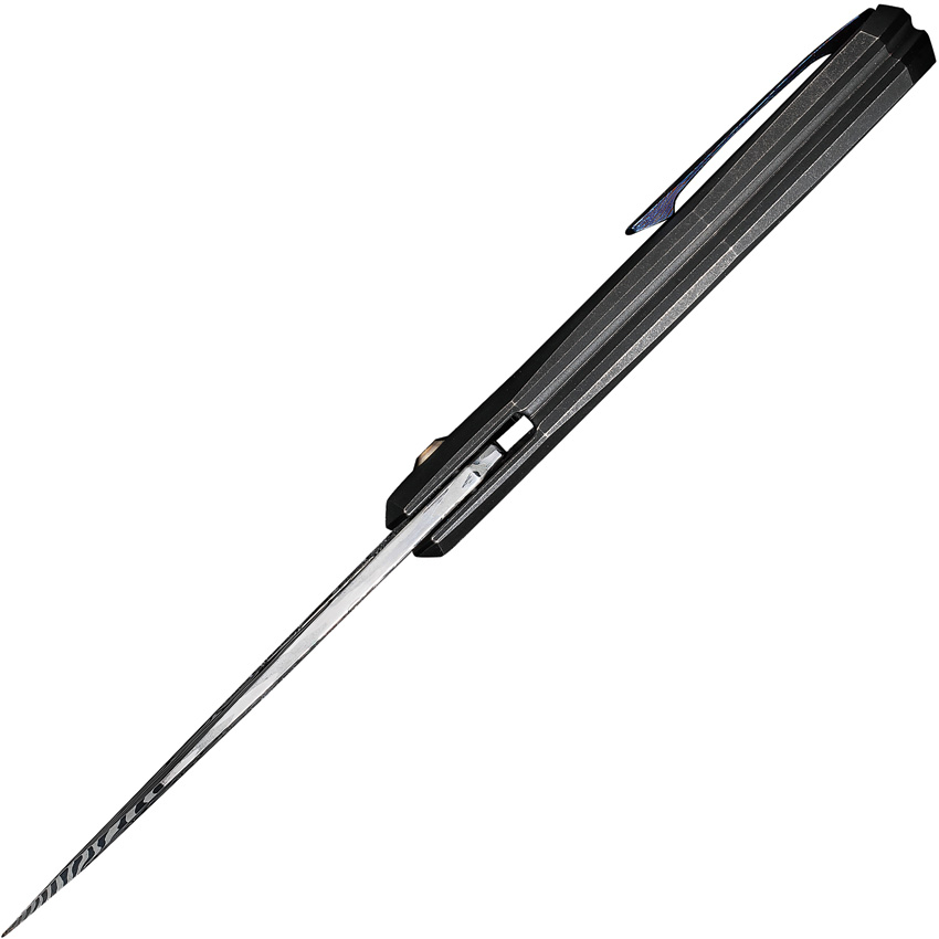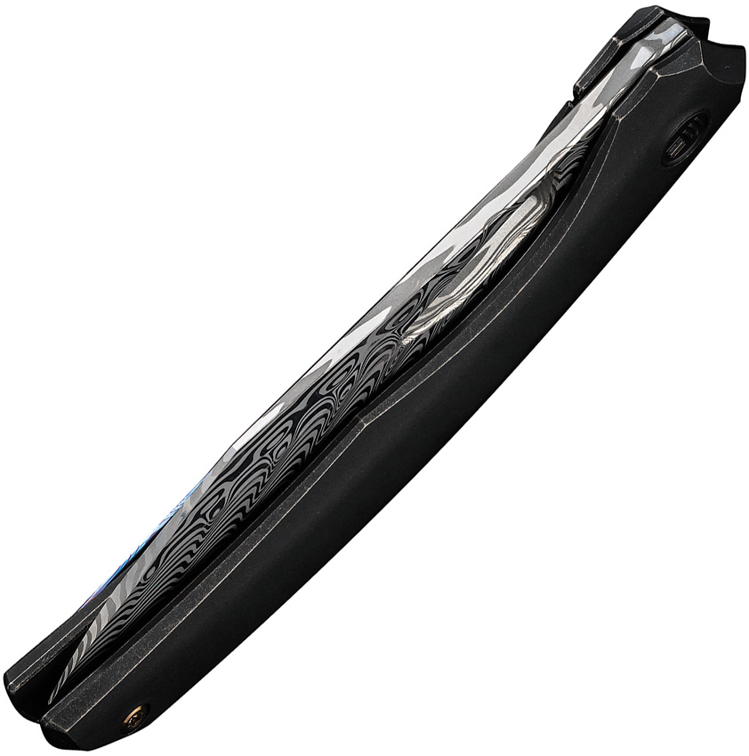 4.38″ (11.13cm) closed. 3.38″ (8.59cm) Damasteel blade. Black stonewash finish titanium handle. Extended tang. Thumb pull. Wharnto (Wharncliffe/tanto) blade. Timascus pocket clip. Black nylon zippered storage case. Boxed.