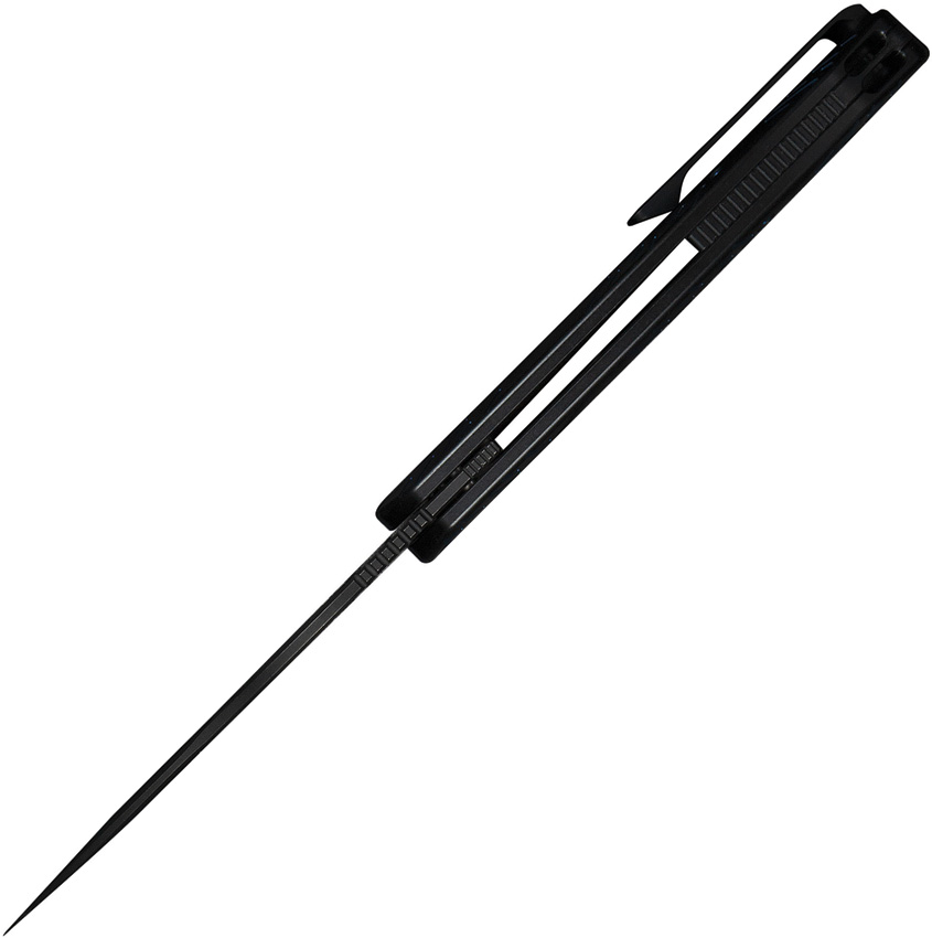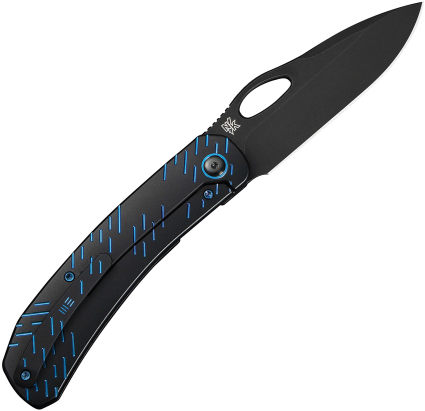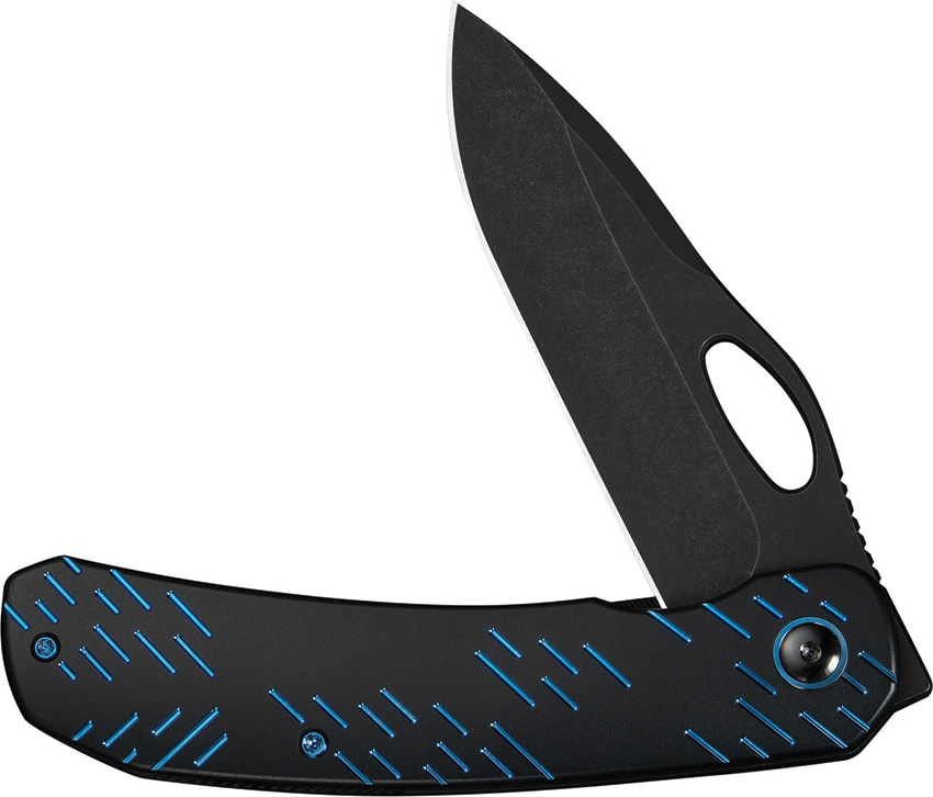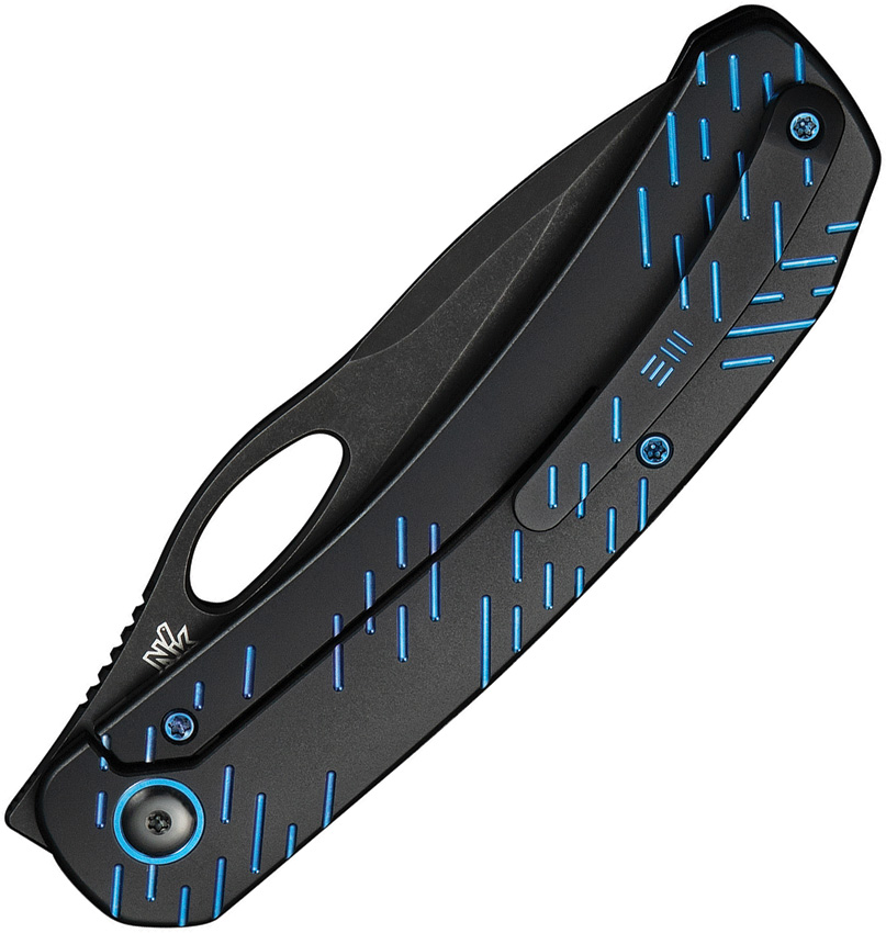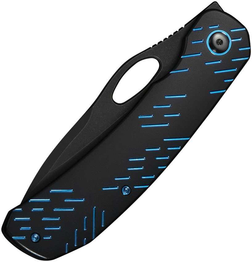 4.75″ (12.07cm) closed. 3.75″ (9.53cm) black stonewash finish CPM-20CV stainless blade. Black titanium handle. Thumb pull. Extended tang. Pocket clip. Blue raindrop pattern handle. Black nylon zippered storage case. Boxed.