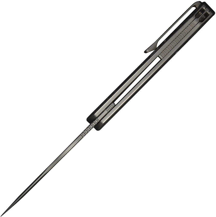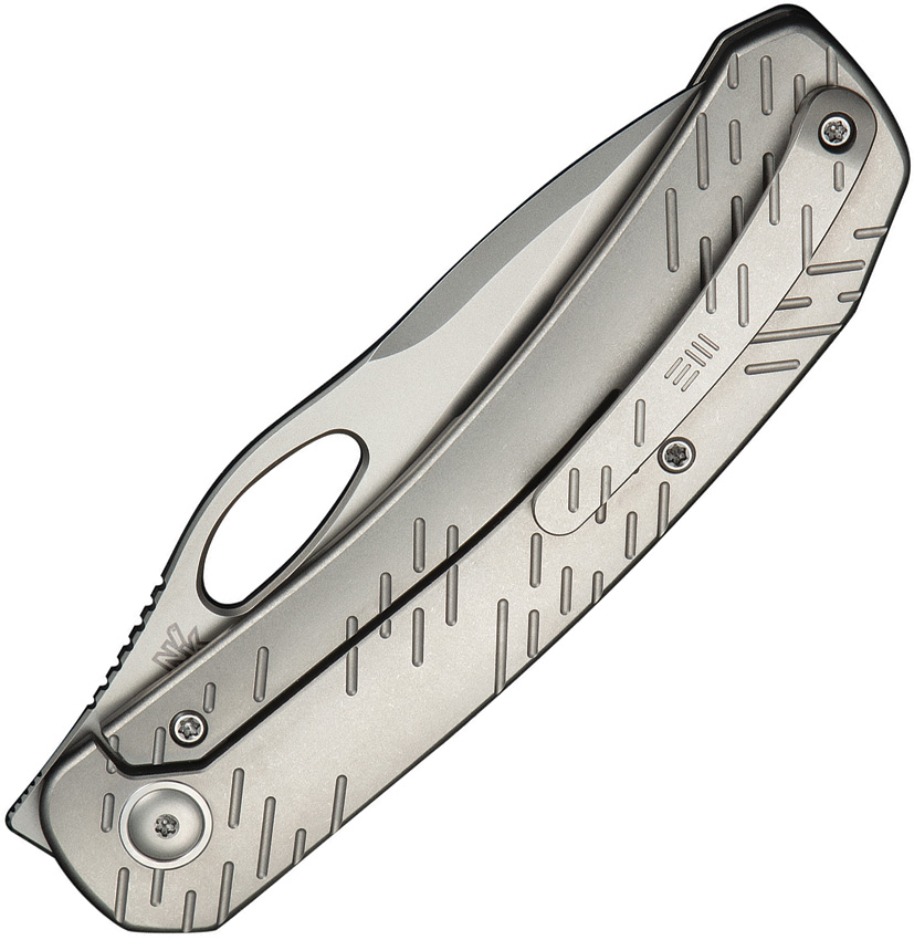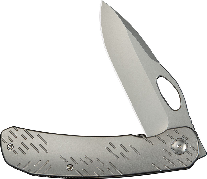4.75″ (12.07cm) closed. 3.75″ (9.53cm) stonewash finish CPM-20CV stainless blade. Gray titanium handle. Thumb pull. Extended tang. Pocket clip. Raindrop pattern handle. Black nylon zippered storage case. Boxed.