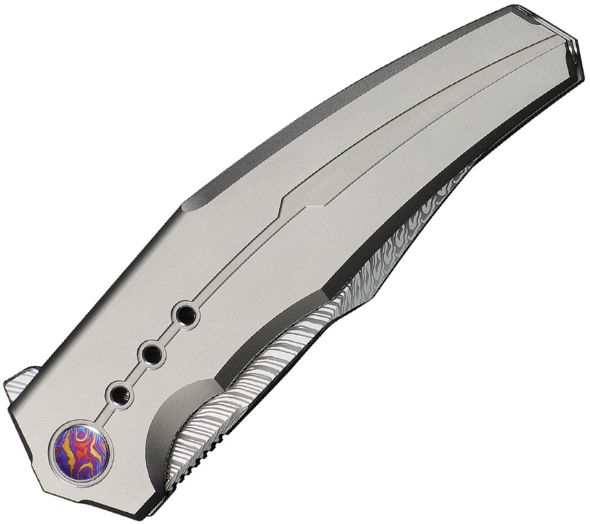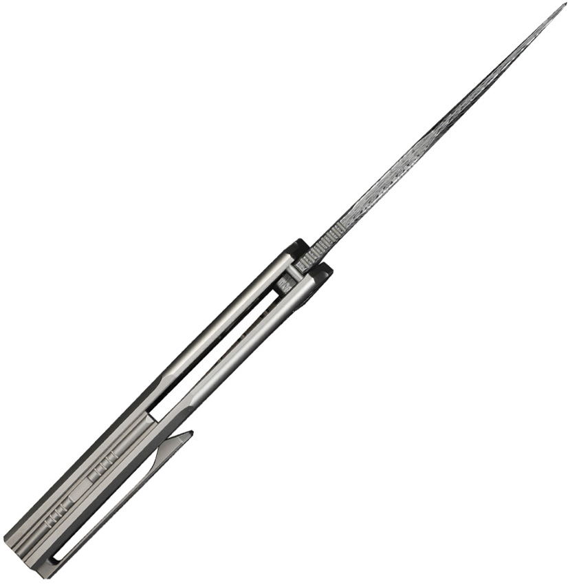 4.75″ (12.07cm) closed. 3.75″ (9.53cm) Damascus steel clip point blade. Satin finish titanium handle. Extended tang. Pocket clip. Timascus pivot screws. Black nylon zippered storage case. Boxed.