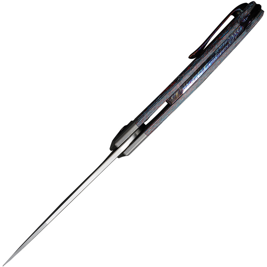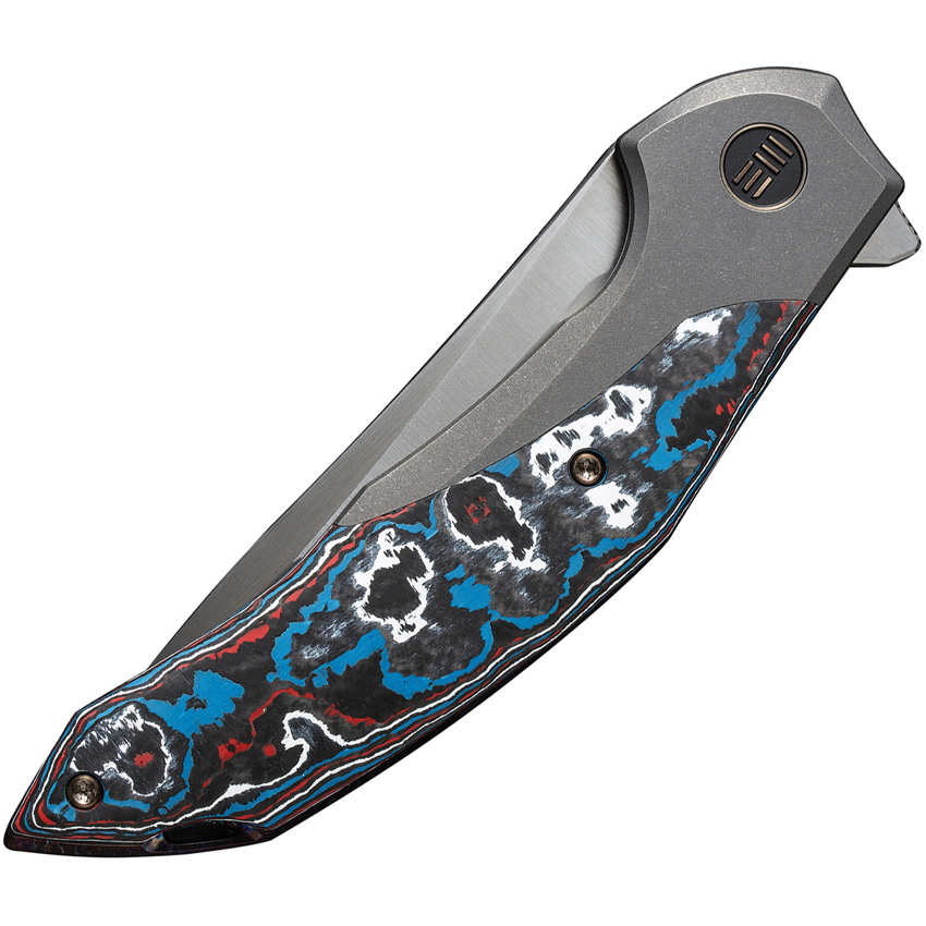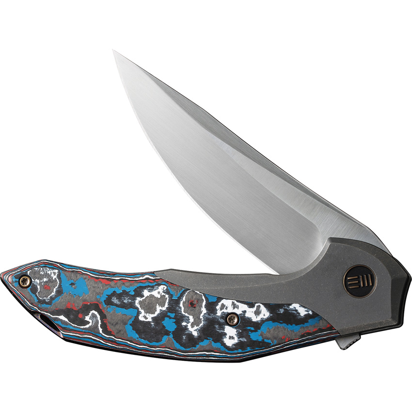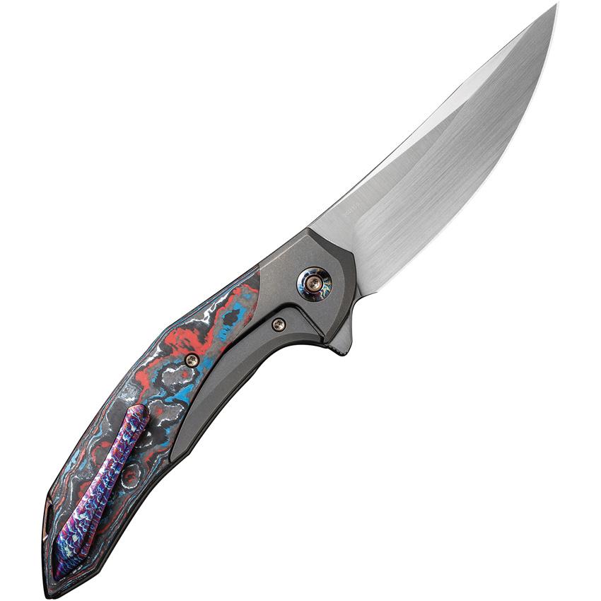 5″ (12.7cm) closed. 3.75″ (9.53cm) satin finish CPM-20CV stainless trailing point blade. Gray stonewash finish titanium handle with Nebula Fat carbon fiber inlay. Extended tang. Lanyard hole. Pocket clip. Limited edition of 205 pieces. Black nylon zippered storage case. Boxed.