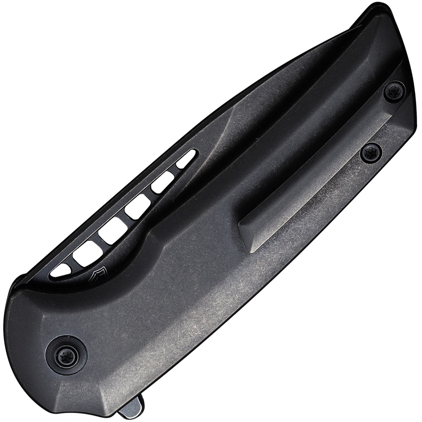 4″ (10.16cm) closed. 3″ (7.62cm) black stonewash finish CPM-20CV stainless blade. Black stonewash finish titanium handle. Extended tang. Pocket clip. Black nylon zippered storage case. Boxed.